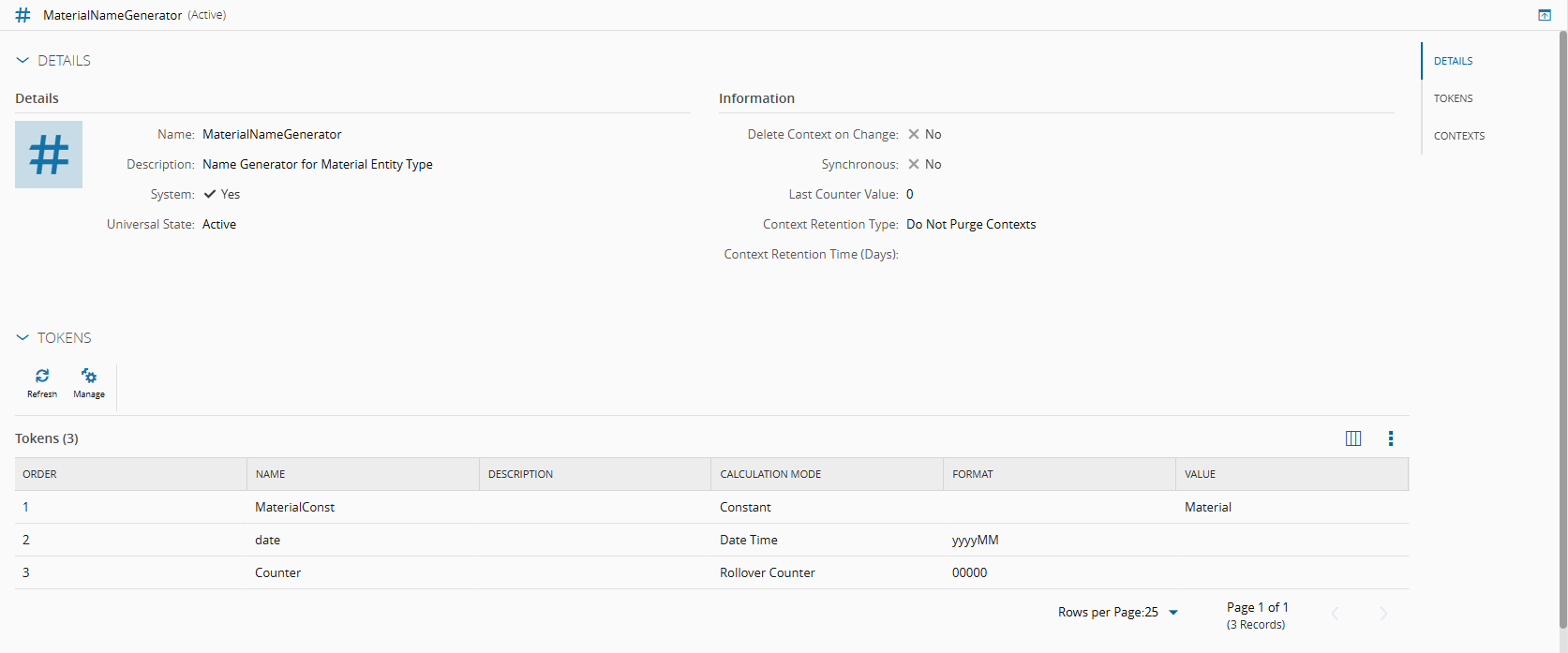 - Material - the first token defined in the Name Generator as a Constant with the value