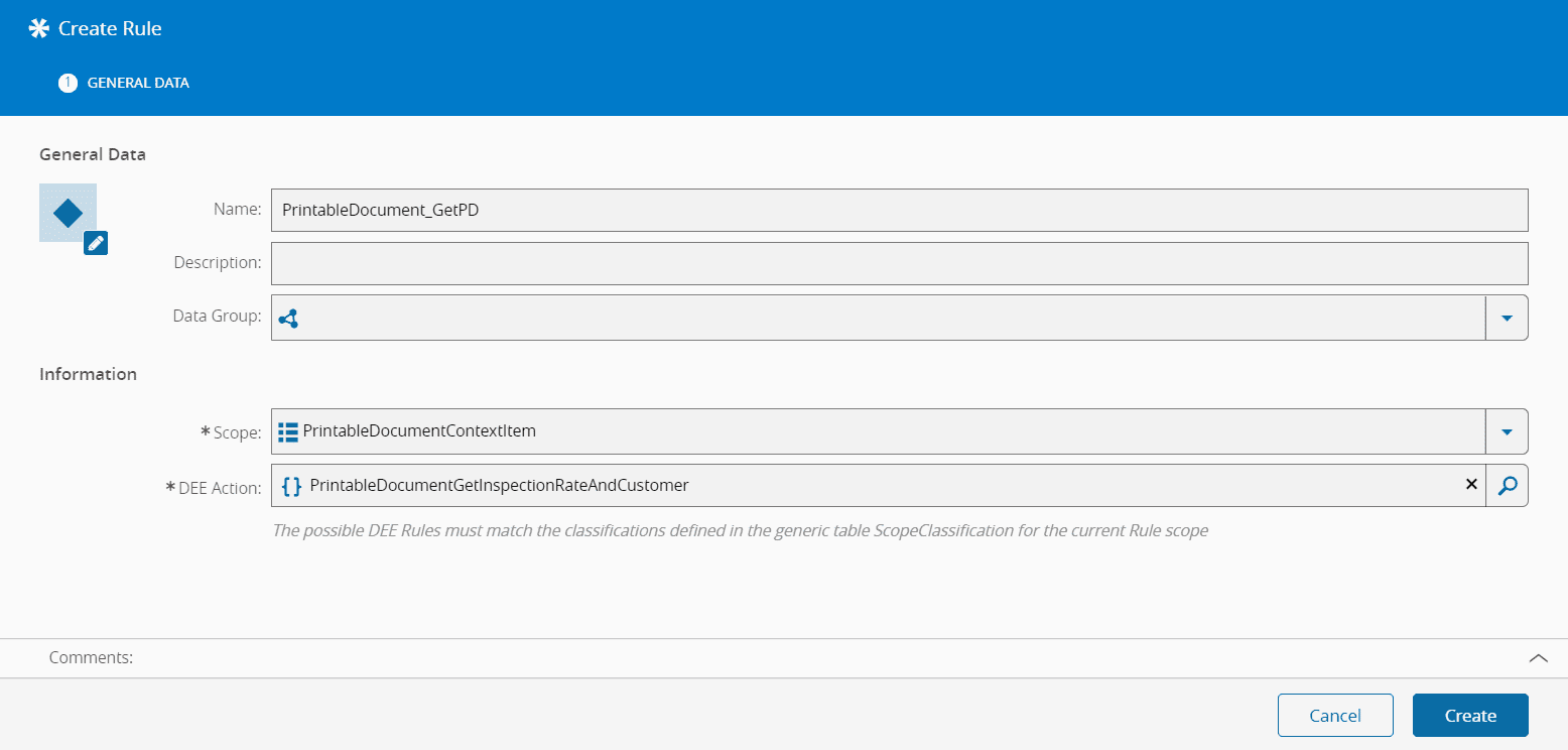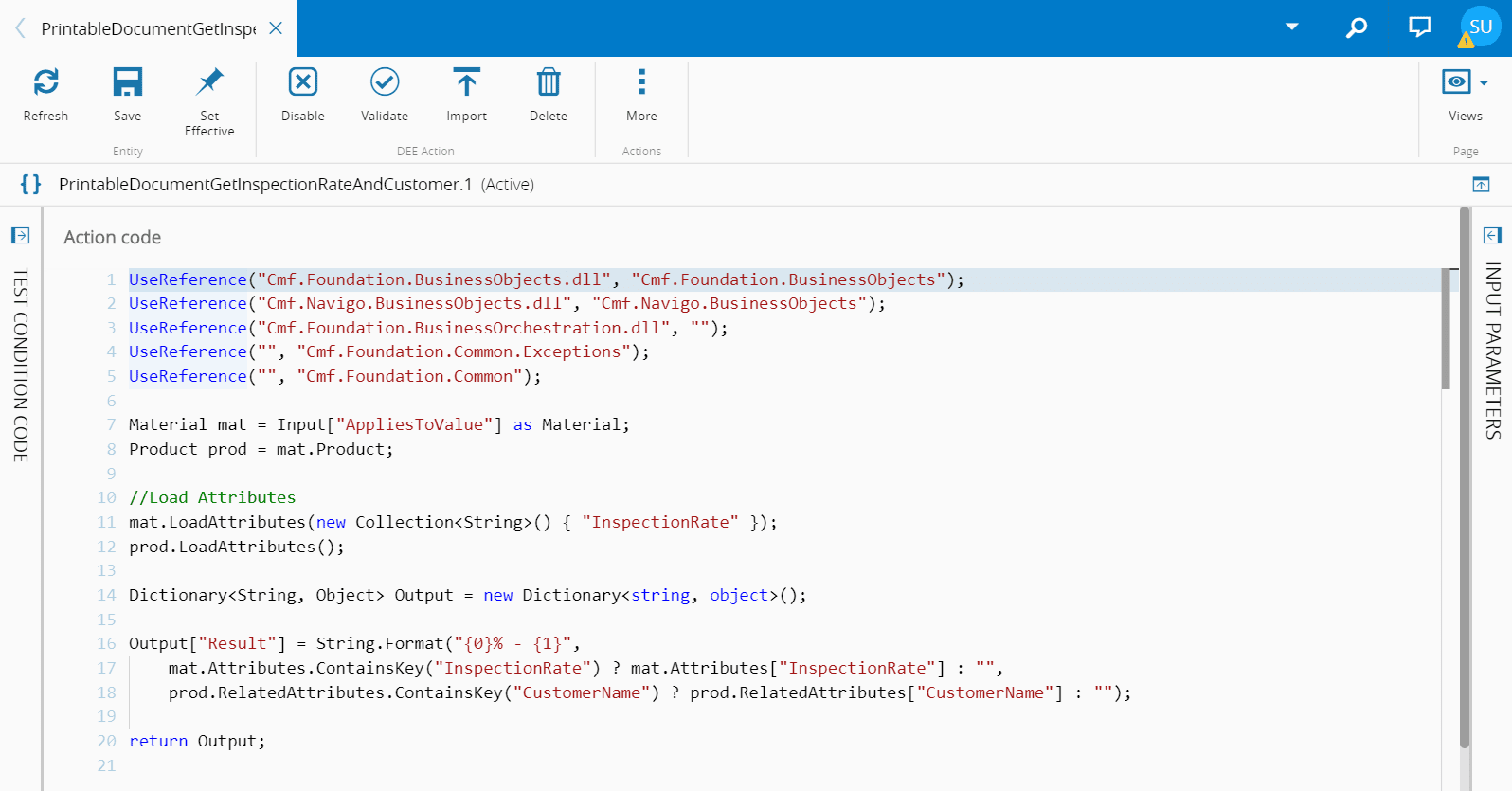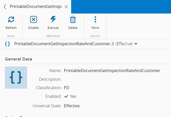Here is a DEE Action sample, called PrintableDocumentGetInspectionRateAndCustomer: