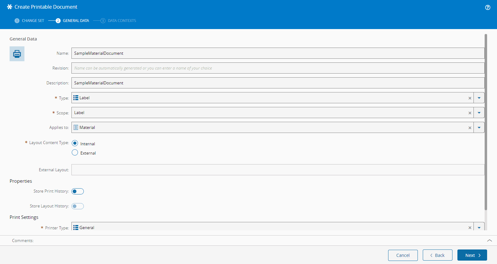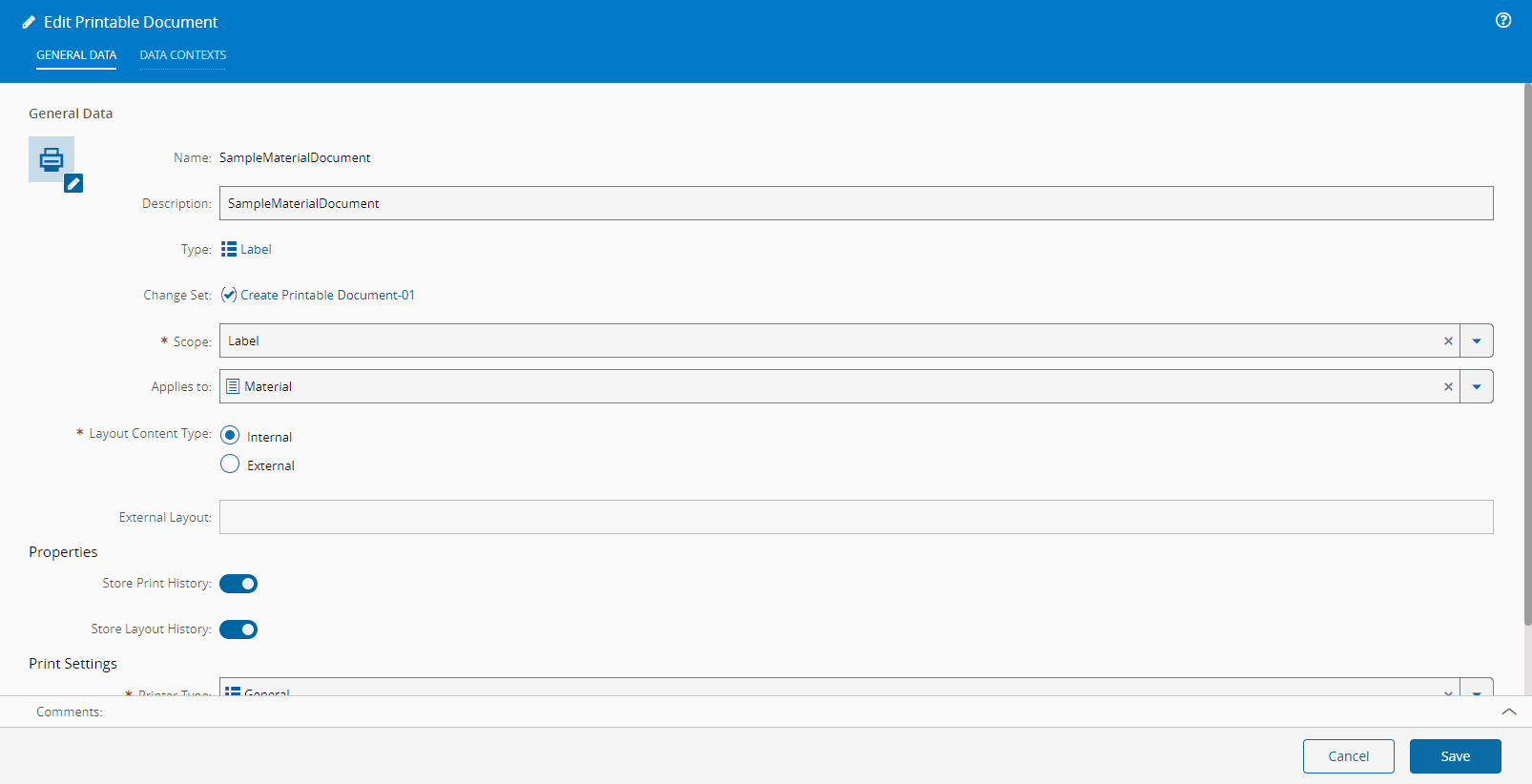 The creation process of a Printable Document suitable for being used in a Lot Traveler is similar to the creation of Printable Document as explained above with the particularity that, it must be of type "Lot Traveler". When a Printable Document is defined of type "Lot Traveler", the Applies To property is automatically set to Material. In addition, three Data Contexts are automatically created: Step, Flow and Flow Path. Because the Lot Traveler is based on dynamic information of the Material, during runtime, the system will supply the appropriate values for these three contexts for each Step.