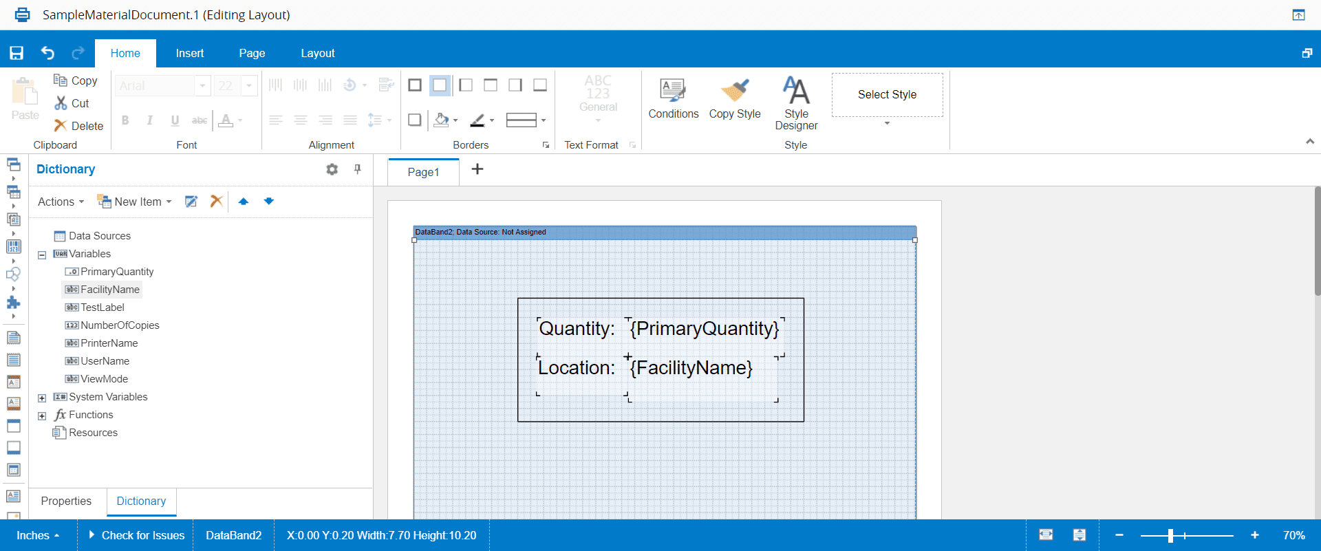 $AppliesToValueentries or use the variables (PrimaryQuantity, FacilityName or TestLabel) that were used in this case. Be sure to save the layout before closing the layout editor.