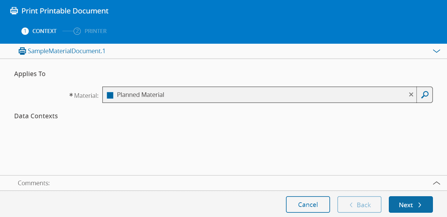 In order to be able to print the document directly from the Material (in alternative, from the Step View or Resource View), it's necessary to define the context in the Smart Table MaterialPrintableDocumentContext. An example is shown in the next picture: