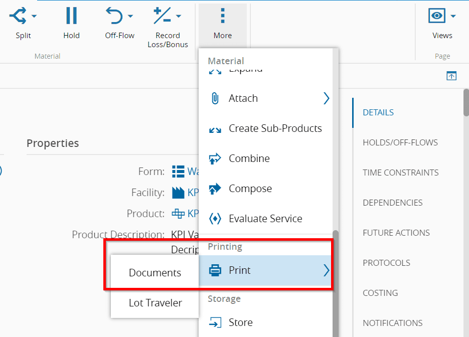 More information on how to print a Lot Traveler or other Material documents can be found at Print Material Documents section of the User Guide.