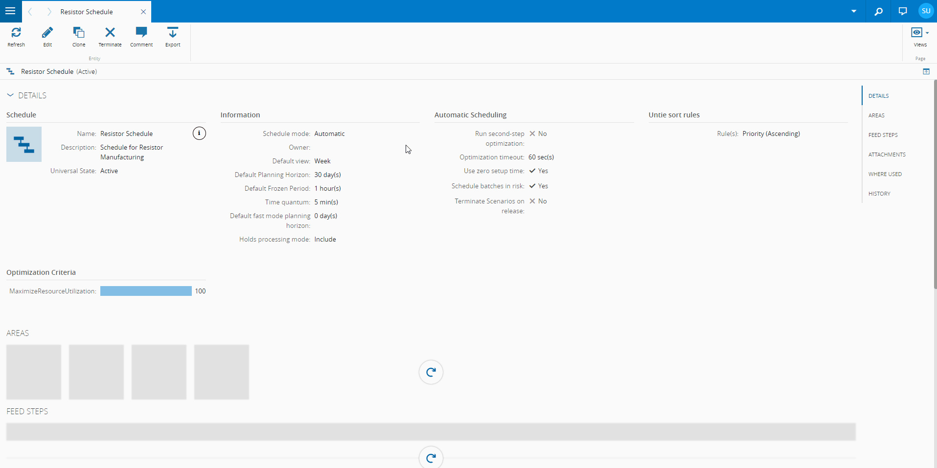 Moving further down, in the areas section, it is possible to see which Areas are connected with the current Schedule: only Resources, Steps, Materials, Durables and Employees which are present within these areas will be taken into consideration for Scheduling.