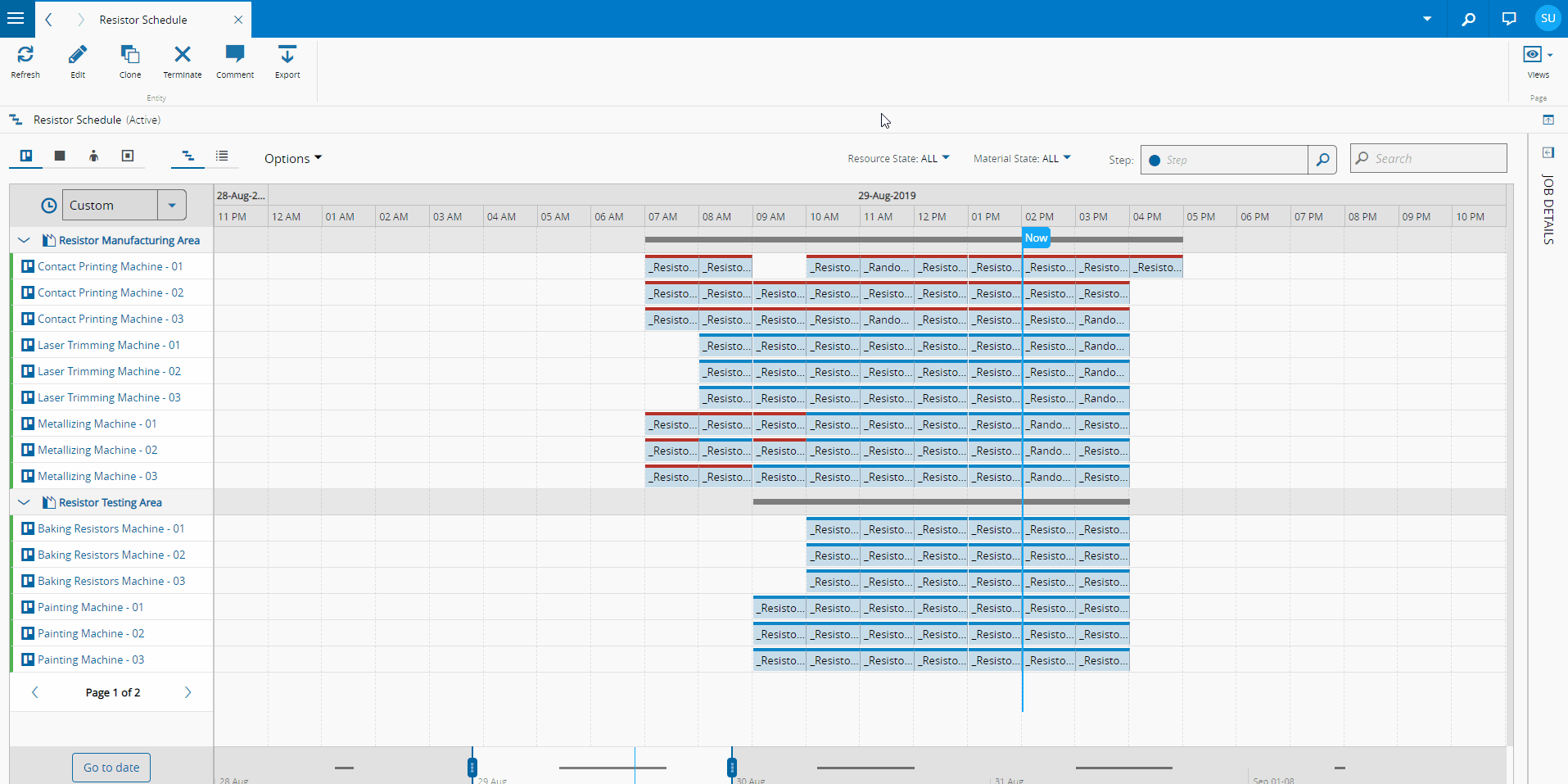 2. By selecting two or more Schedule Scenarios on the Scheduling Scenarios view and clicking Compare, the comparison view opens. This allows a head to head comparison of each planned Material (real or virtual) execution in different Scenarios, either in Calendar or List view. It also allows to compare the Planned End Date for the Material with its Due Date, represented by a diamond symbol. This symbol acquires a specific color according to the fulfillment of the Due Date: