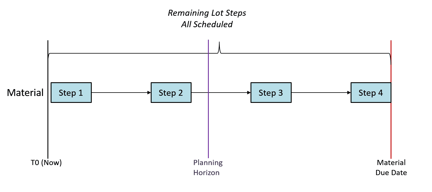 The operational accurate scheduling mode, schedules all the remaining Steps for the (real) Materials based on their current position in the Flow Path. As long as one of the Jobs falls within the planning horizon, the system will try to schedule always all the Jobs for the Material, even if it falls beyond the Planning Horizon.