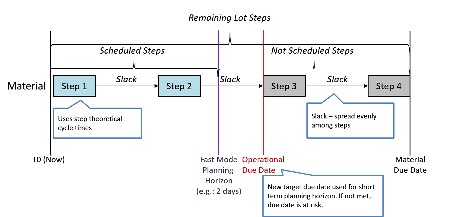 The operational fast mode reduces the number of Jobs to be scheduled by the scheduling engine thus speeding up the scheduling generation process. It assumes that the schedule is re-generated periodically and often, so that it is only necessary to schedule the Jobs for the short term. It calculates the theoretical process times for the Material's remaining steps, it divides the available slack between all the remaining Steps and then schedules only the Jobs that fall within the Fast Mode Planning Horizon.