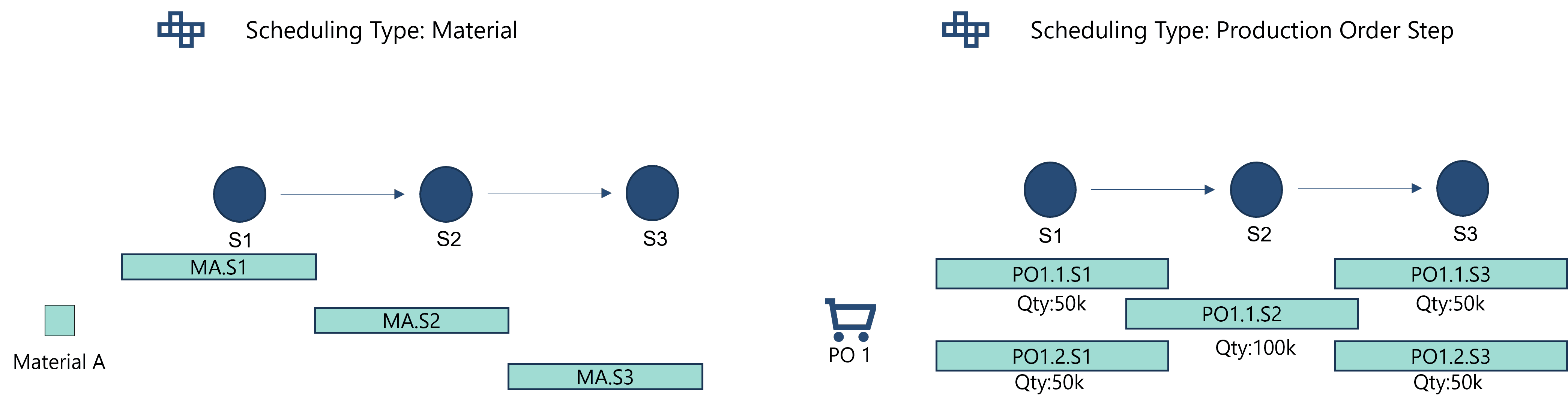 Depending on the need to break down a single Production Order into separate Production Order Steps, two different Scheduling Types are available in the system and can be configured at the Product level: