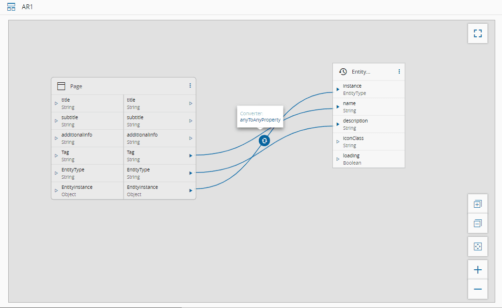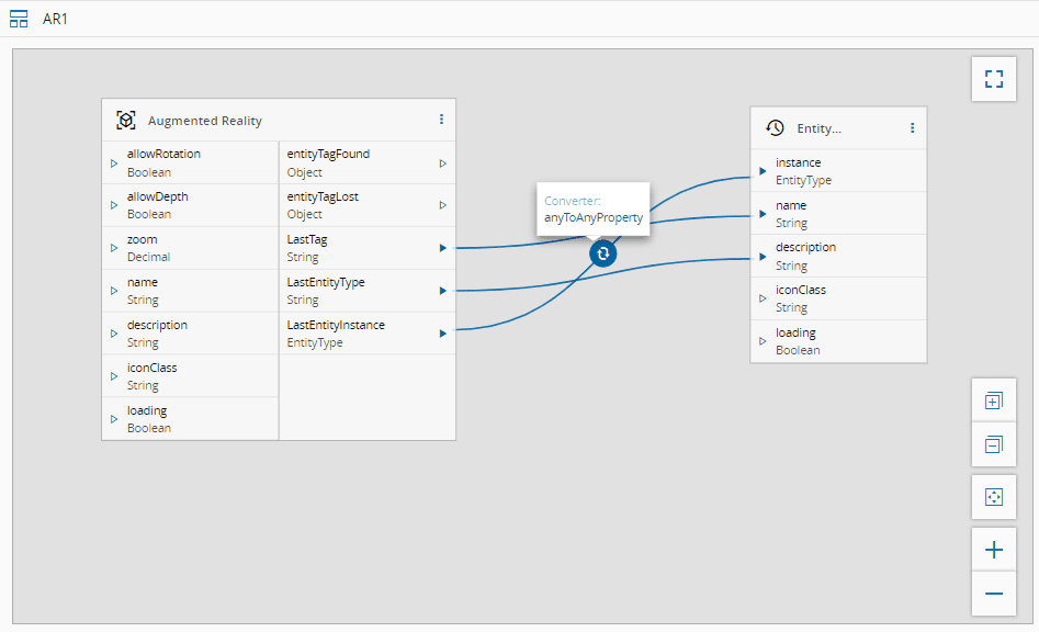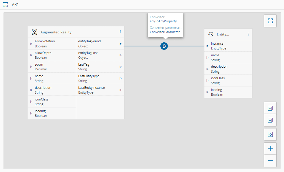 The objects entityTagLost and entityTagFound contain the list of properties shown in the Augmented Reality UI Page parameters table. These properties can be accessed by using the anyToAnyProperty converter and supplying as the ConverterParameter the name of the property. Typically, the ConverterParameters would be a static property like the UI Page. This process is described in the image below: