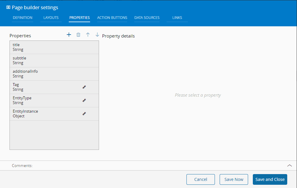 In this example, the Widget is linked with the properties LastTag, LastEntityType, and LastEntityInstance as seen in the image below: