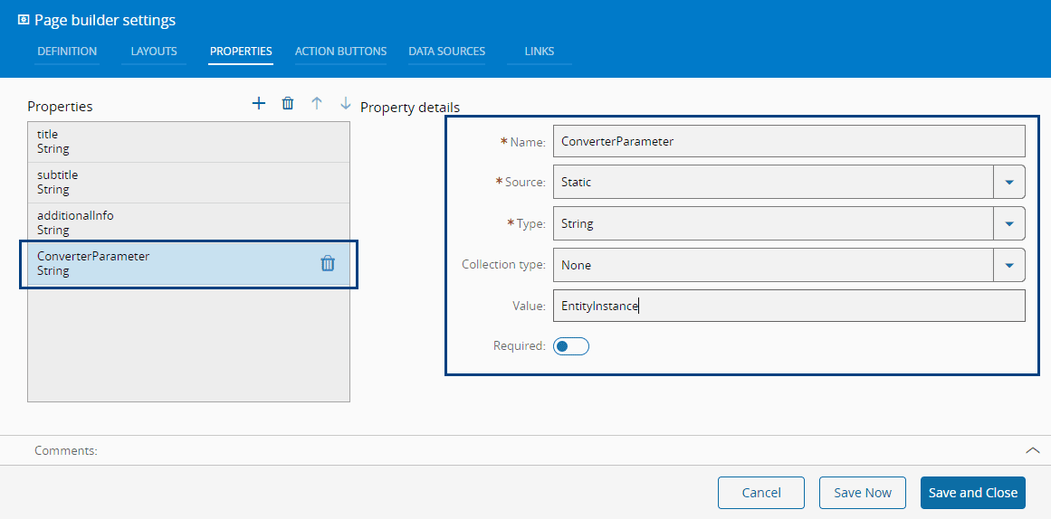 The parameters can then be supplied to any UI Page widget. In the image below, the three parameters are passed to an Entity History widget. In the case of the EntityInstance, the converter that is used is the anyToAnyProperty without any Converter Parameter.