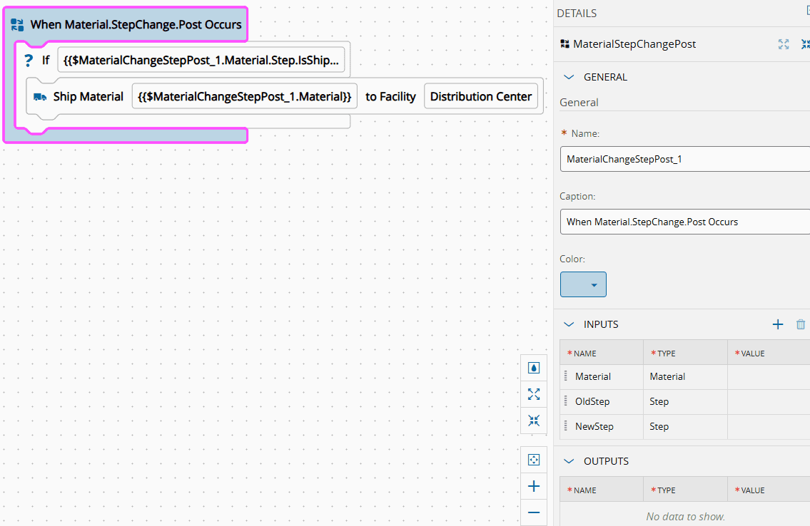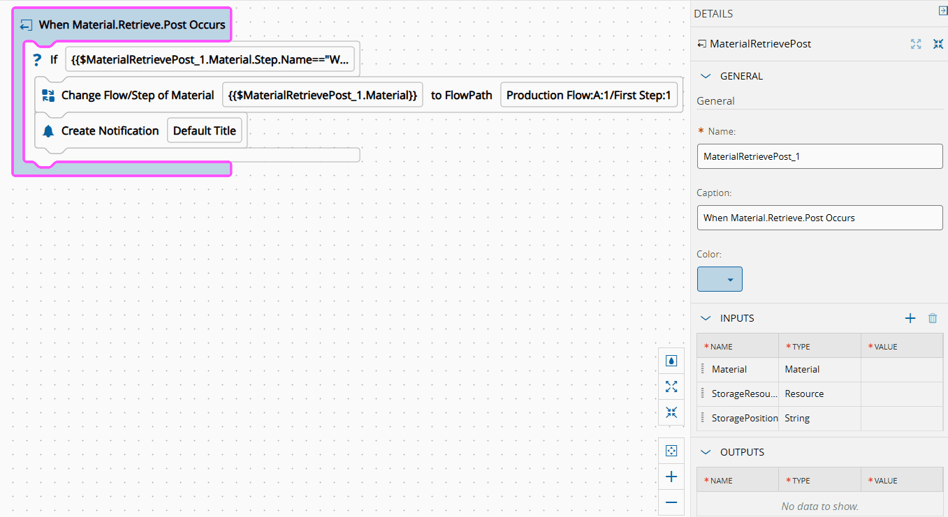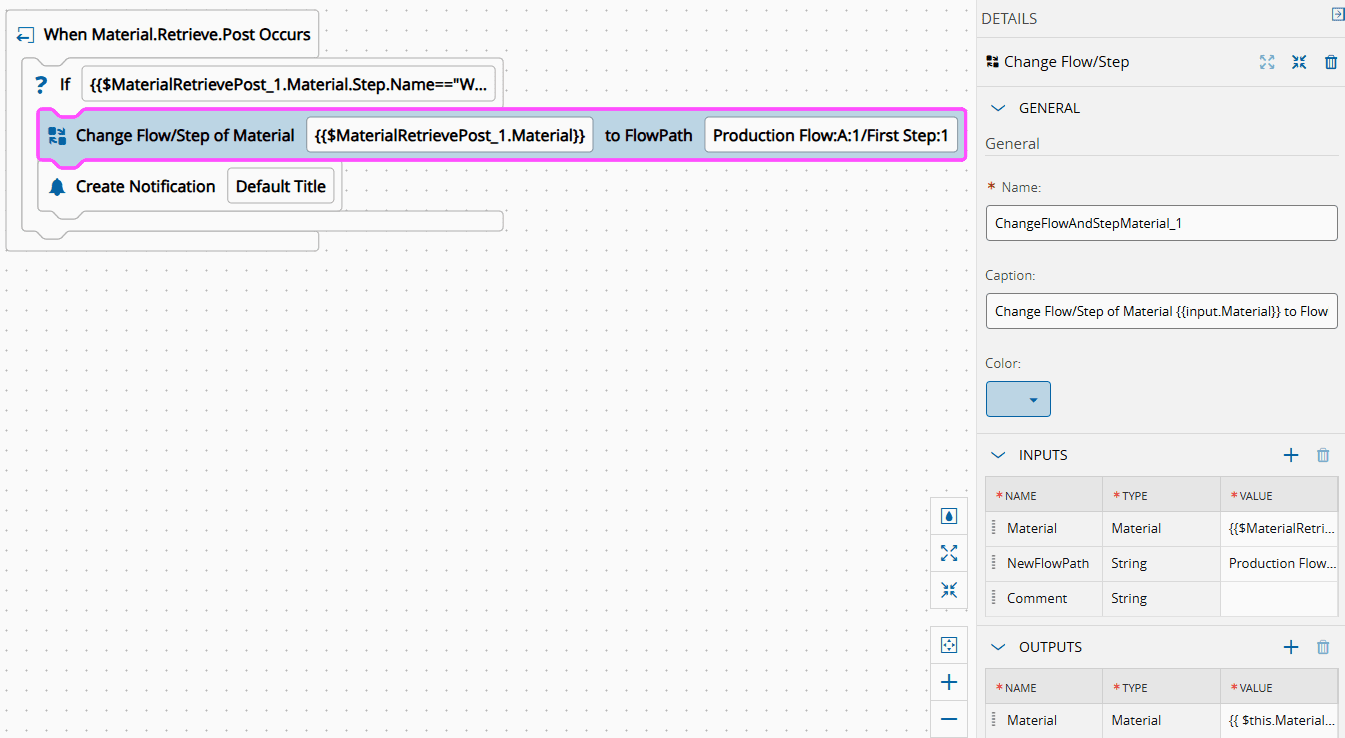 Consider the scenario where the requirements are: if a Material is retrieved from the Warehouse Step, it should automatically be moved to the Step where production starts, by updating its Flow and Step.