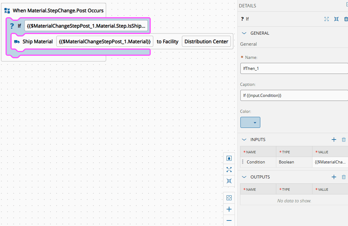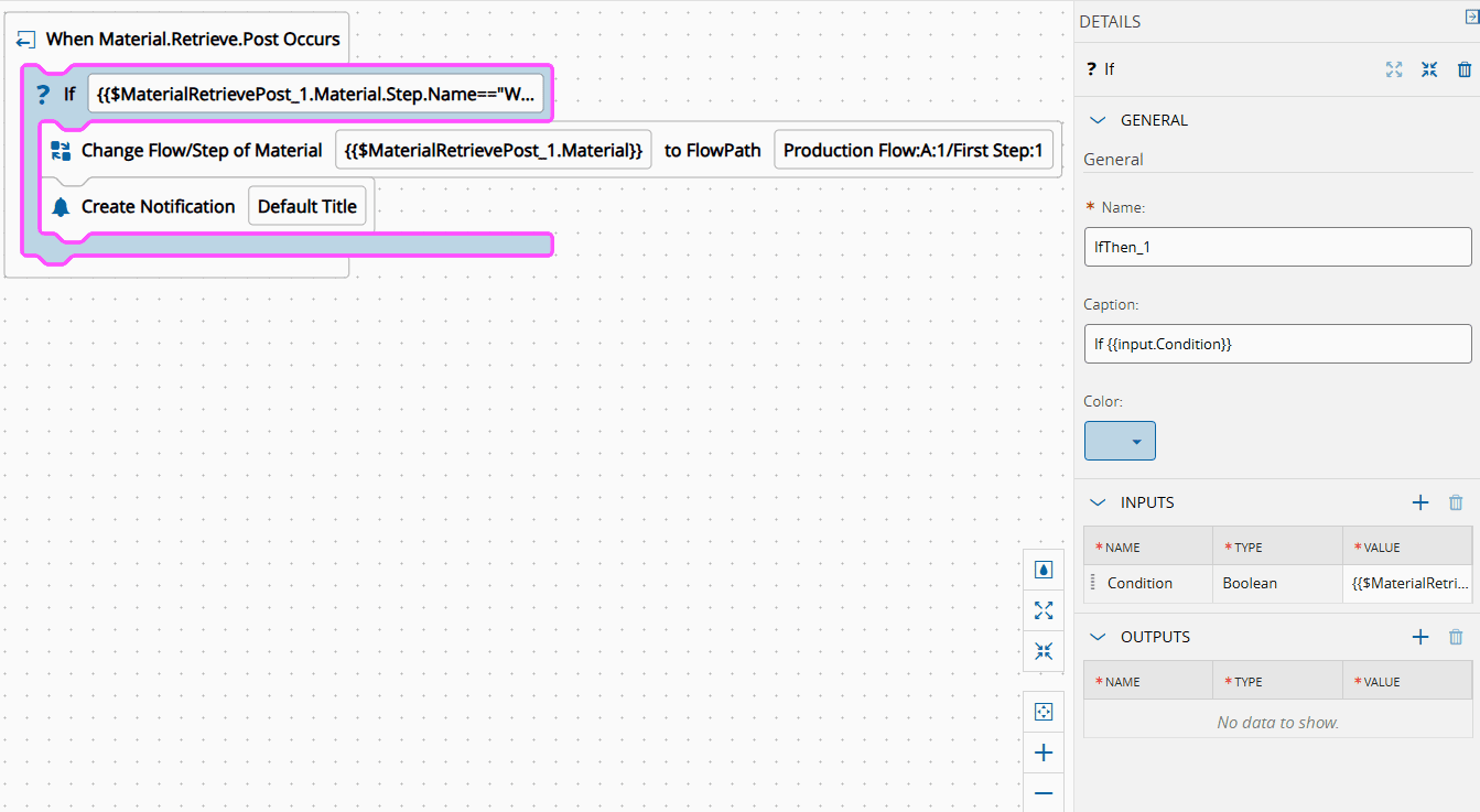 A condition must then be evaluated to ascertain whether the Step from which the Material is retrieved is the Warehouse Step. This requires the use of the Logic Task If task. If the condition is met, two actions should follow: