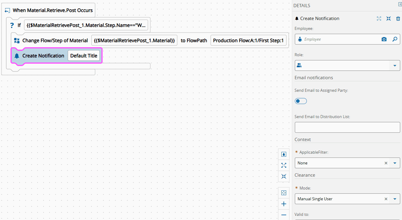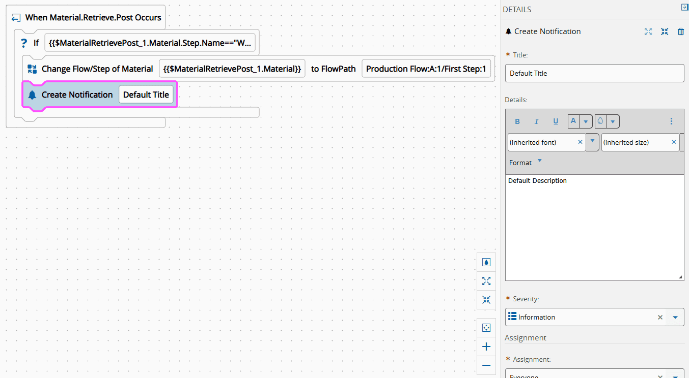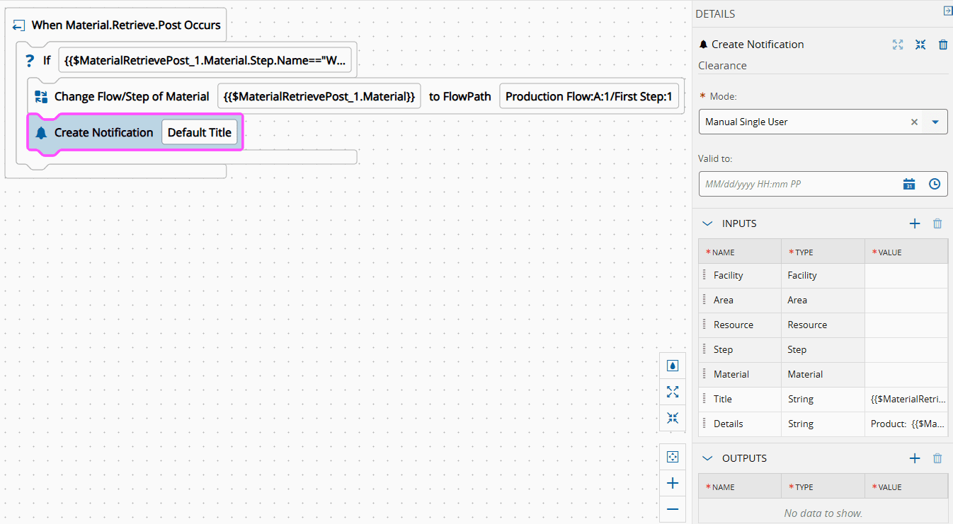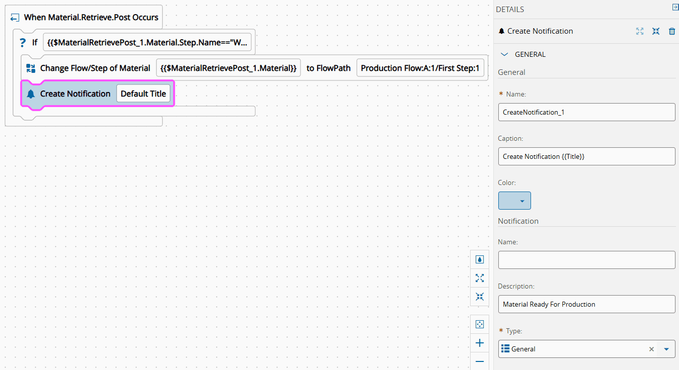 - A Notification should be sent, using the MES Notification Task Create Notification task. In this case, we'll use a general notification that dynamically displays the Material name, along with its Product, Step, and Facility.