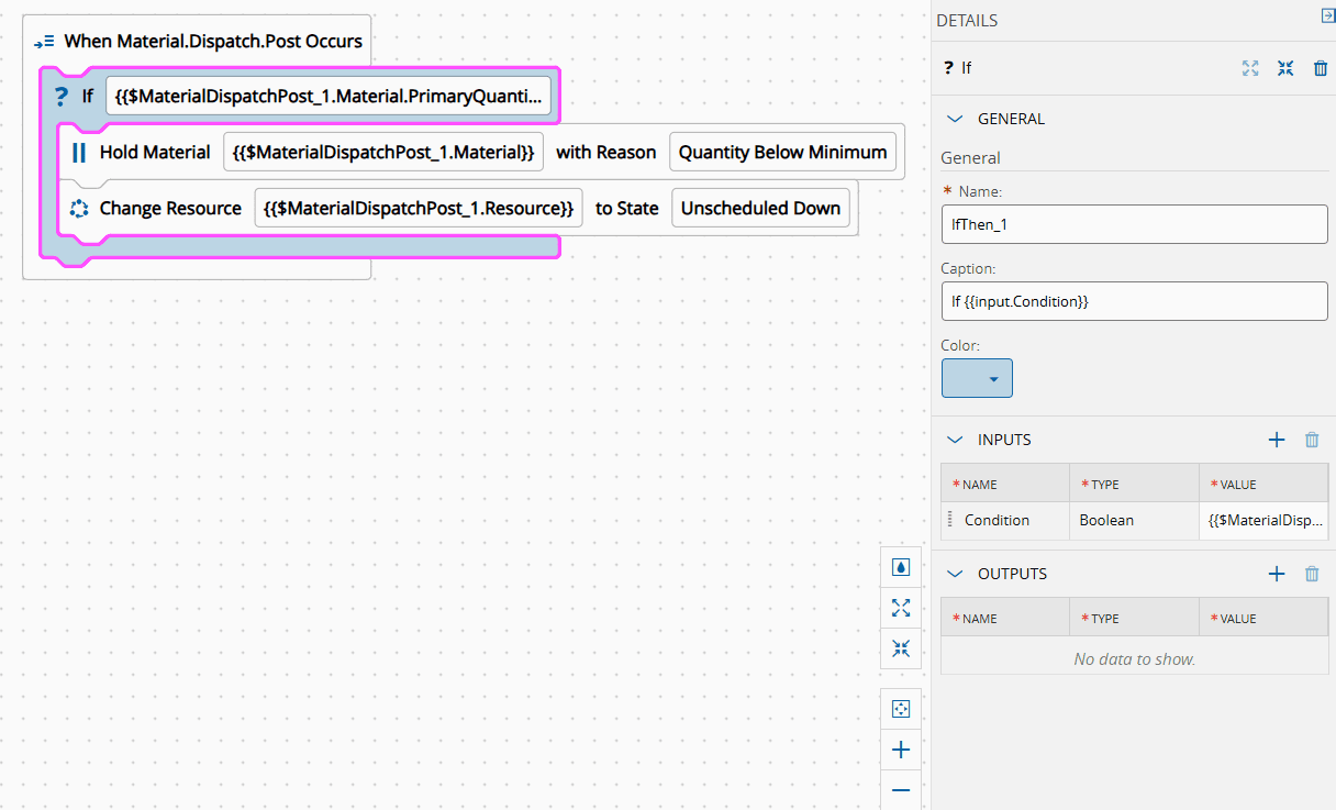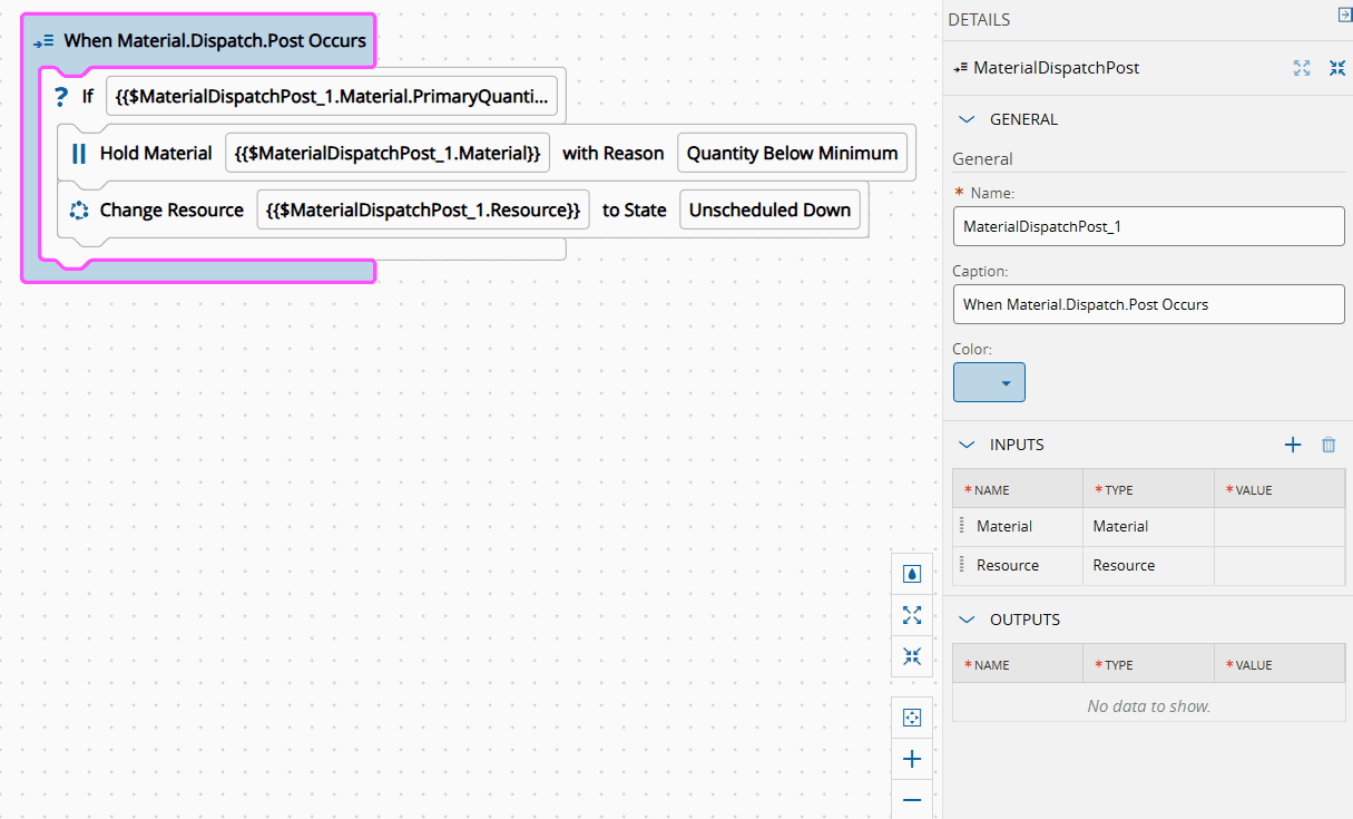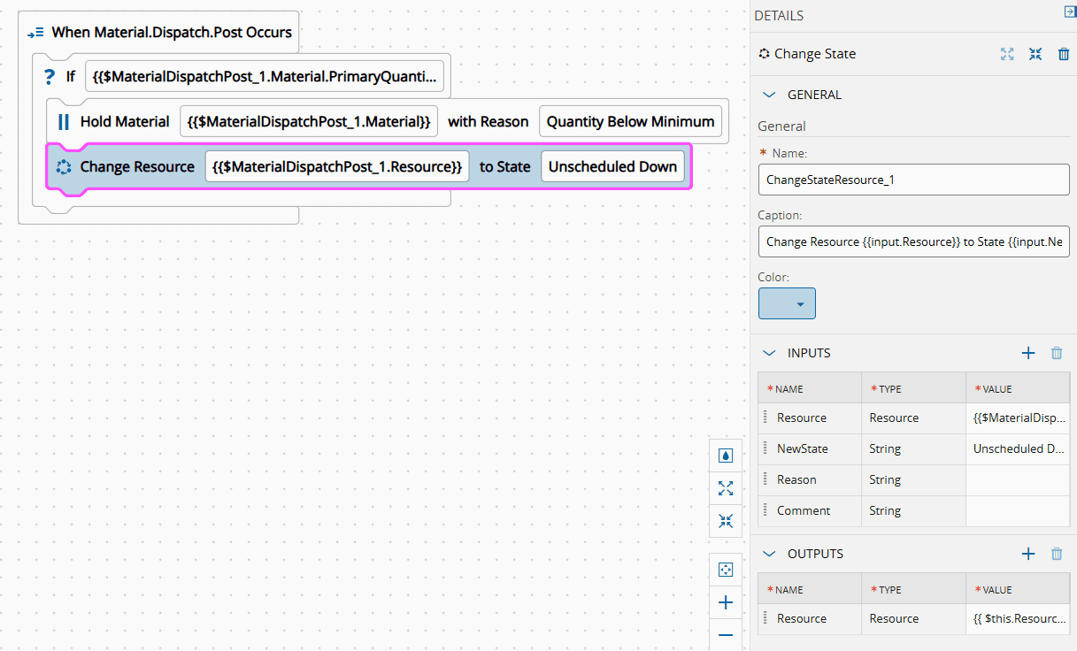 The requirement is: if a Material is dispatched and this minimum is not met, it should automatically be placed on hold with the "Quantity Below Minimum" Reason, and the Resource should transition to the Unscheduled Down state.