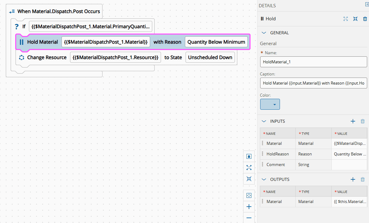 Drag and drop the MES Material Task Hold, and configure its inputs:
