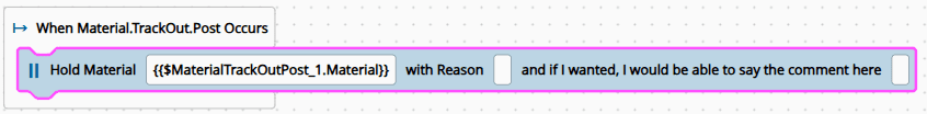 {{input.Material}}with{{input.HoldReason}}Reason and if I wanted, I would be able to say the comment here{{input.Comment}}