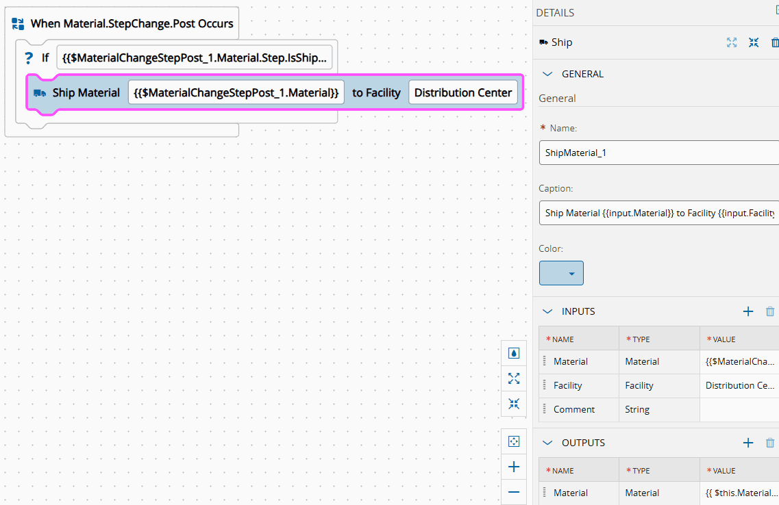 - Drag and drop the MES Material Task Ship, and configure its inputs: