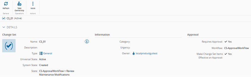 This is where the “Take Change Set Ownership“ action comes into play. A User can choose to take ownership of a Change Set, which then allows them to initiate the approval request for that workflow.