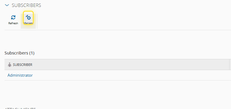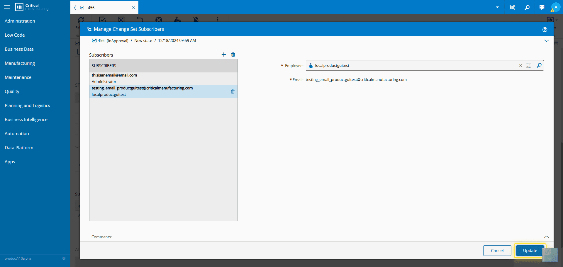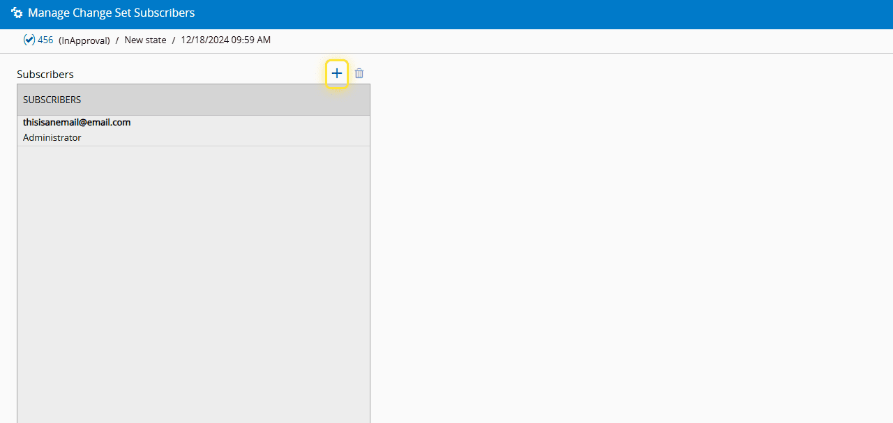 How to: Manage Change Set Subscribers# 1. Go to the Business Data menu.# 2. Select the Change Set entity.# 3. Select the Change Set.# 4. Go to the Subscribers page section.# 5. Select the Manage button.# 6. Manage the Subscribers by adding or removing Employees.# 7. Select the Update button.#