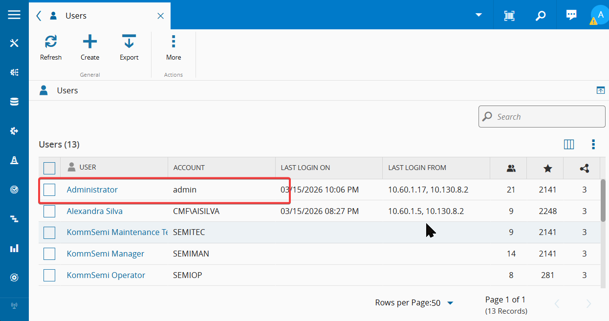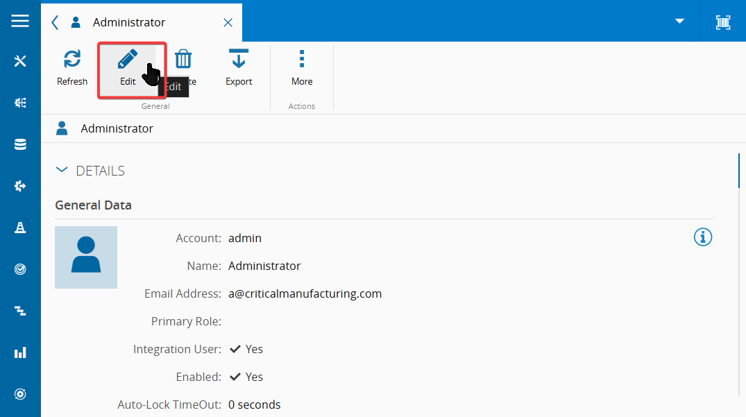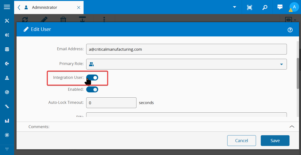 Before Connect IoT can authenticate as an MES user, that user must have the Integration User flag enabled. Without it, the Automation Manager cannot establish a session with MES. Follow the steps below to enable the flag on the target user account.
