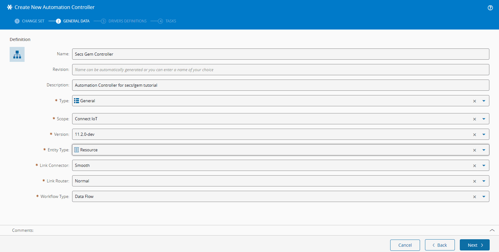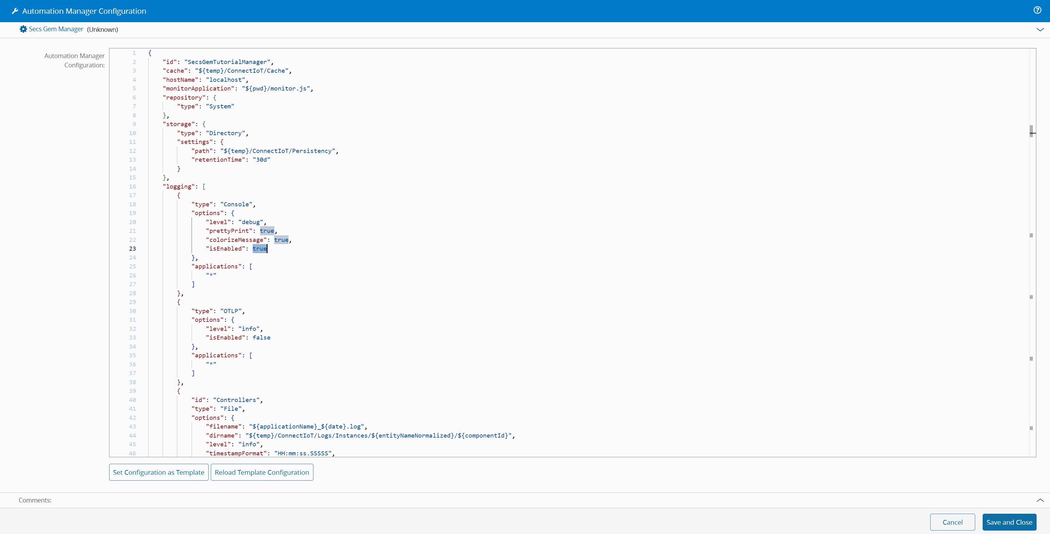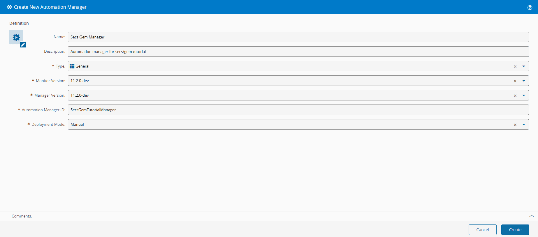 Enter the name, description, type and provide a unique name (in this example SecsGemTutorialManager) as the Automation Manager ID.