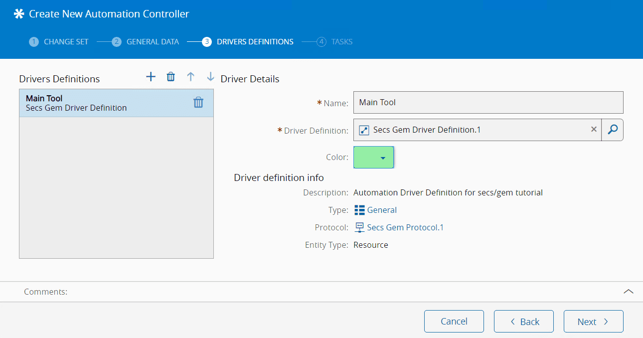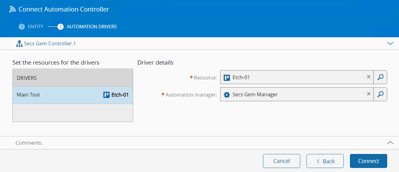 In the Automation Drivers panel select the Main Tool driver and choose the same resource chosen before for the controller (Etch-01 in this example).