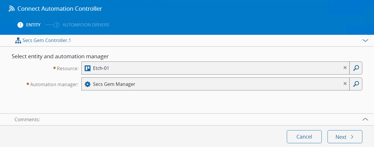 The entity that gets selected will provide context to either the controller or driver definitions. The controller and each driver definition might have distinct entities associated to it. For example, let's consider a line with 3 equipment. The controller entity might be associated to the resource that represents the line, and each individual driver definition the corresponding equipment resource.