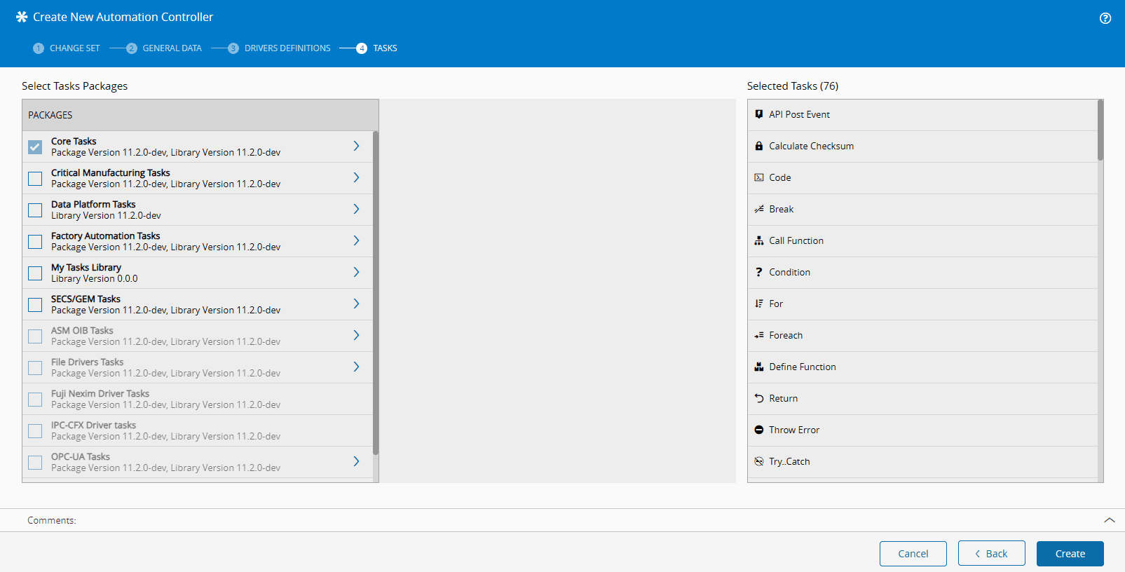 In the tasks panel, select the task packages that will be relevant for the integration itself and available in the workflow designer. For this tutorial, the Core Package - connect-iot-controller-engine-core-tasks - is enough.