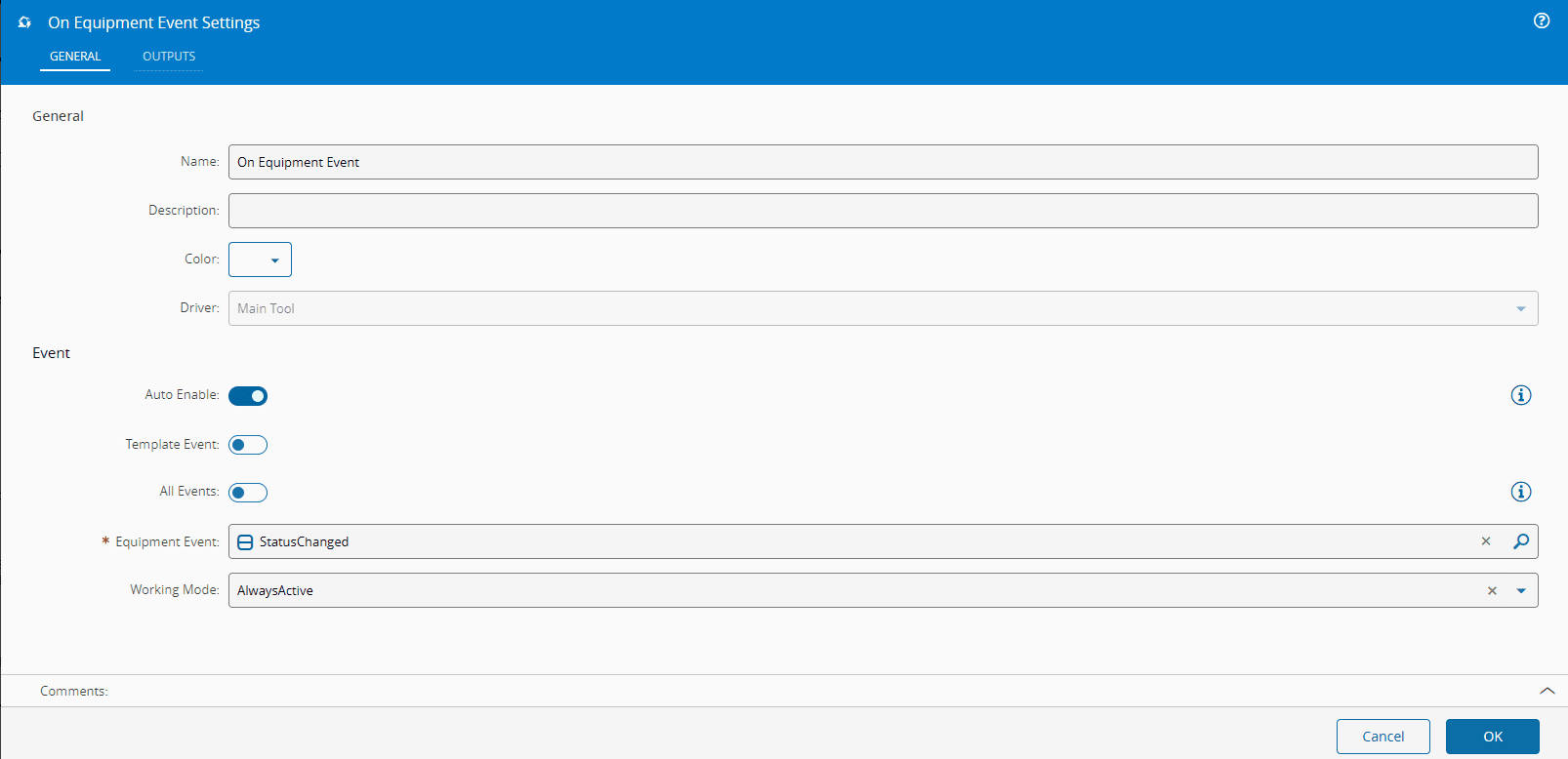 There is only three outputs for the On Equipment Event task. These are the default ones. As soon as a specific event is configured, the associated properties, if any, will be displayed as outputs as well.