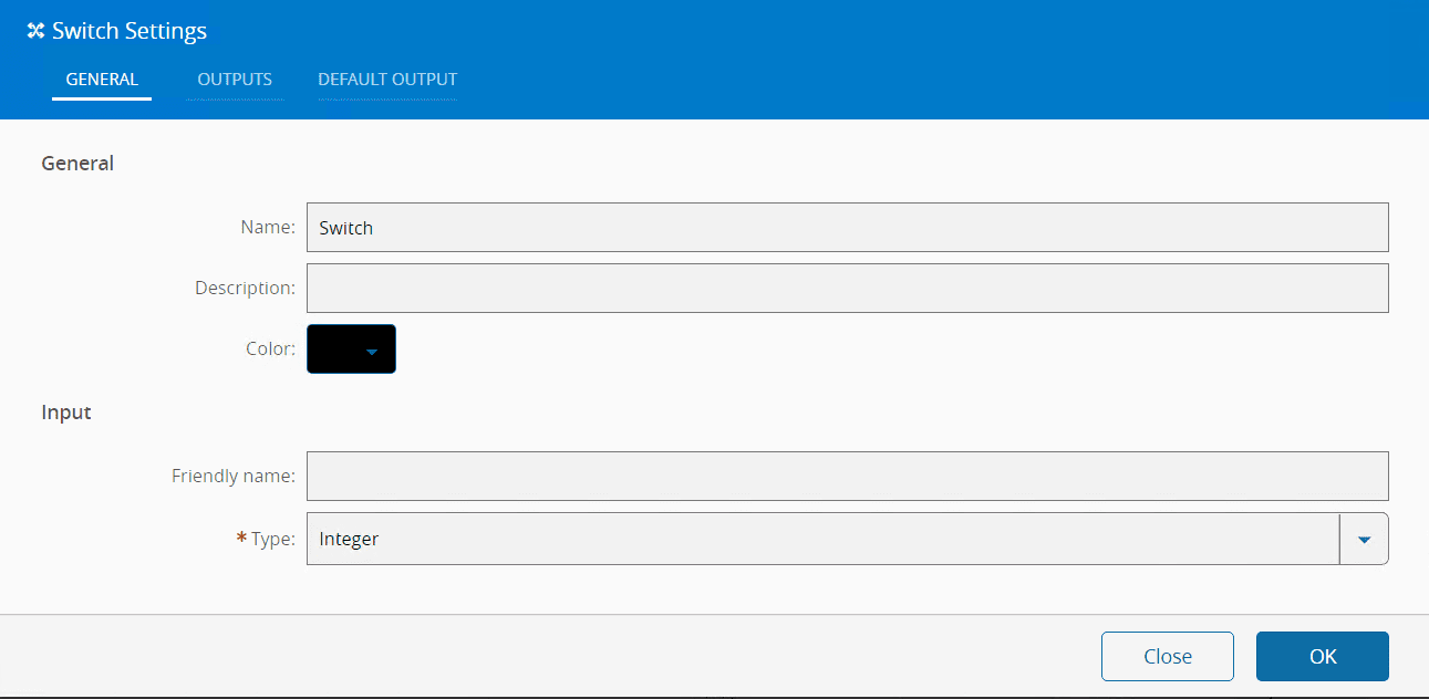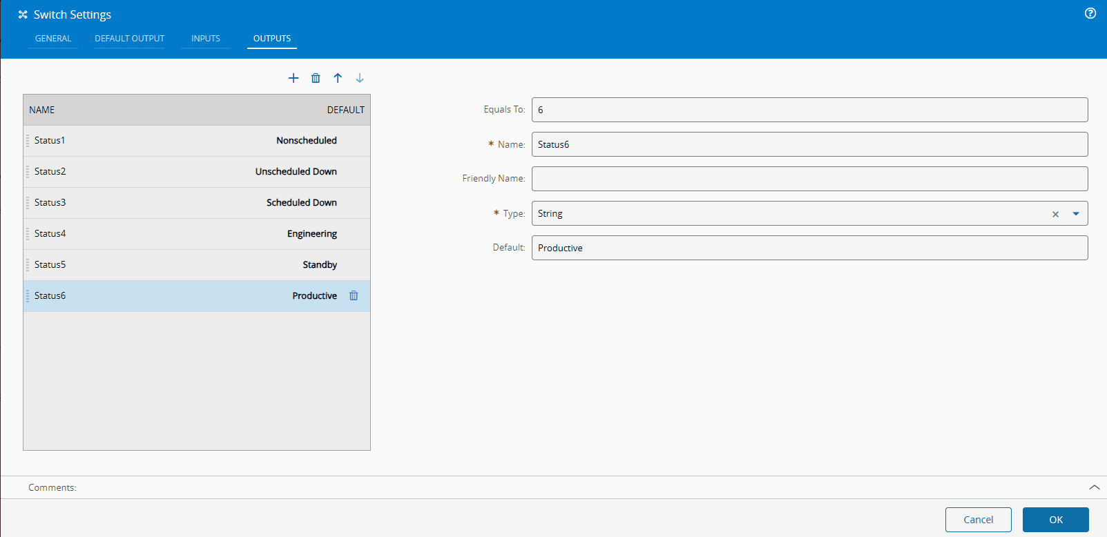 In the Outputs panel, add 6 output entries. For each one, configure the Name, Equals to, Type and Value, as shown below. All output types are String and the Equals to goes from 1 to 6.