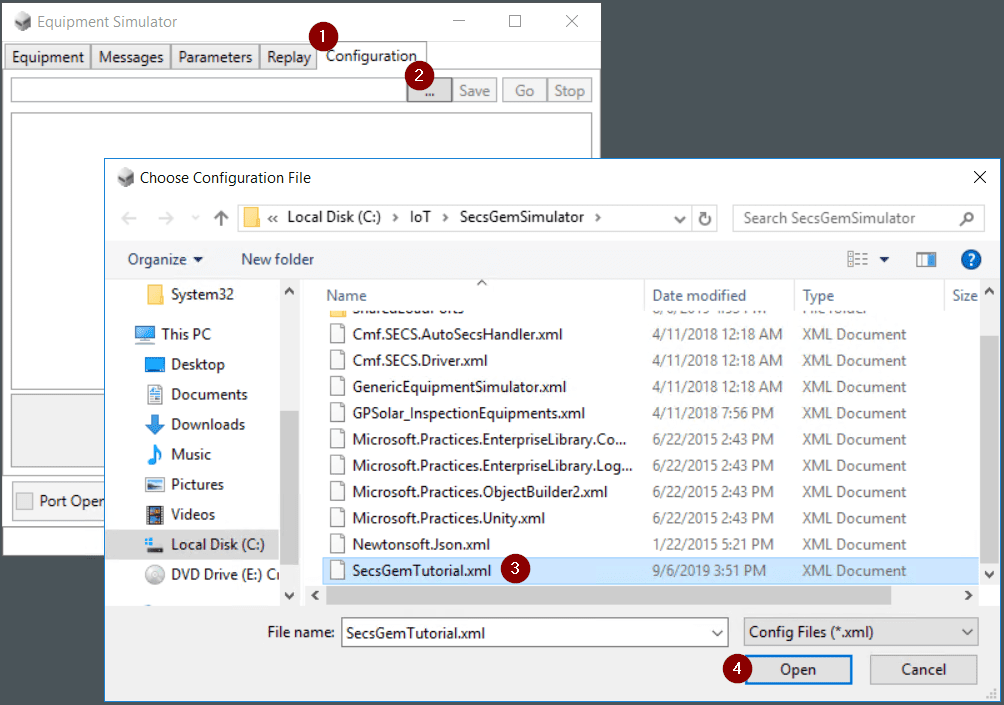Go to the Configuration tab (1). Select the ...button (2) to open the simulation configuration file. Select the SecsGemTutorial.xml file and select the Open button.