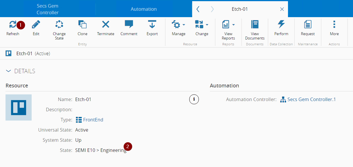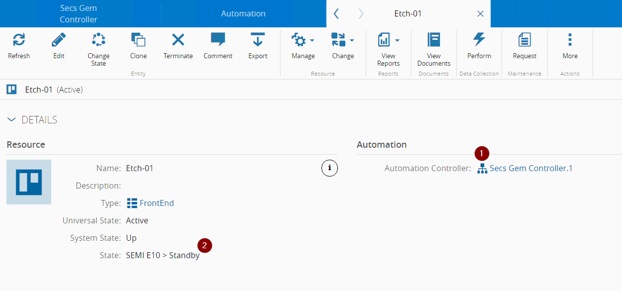 You can see that the resource is associated to the Secs Gem Controller.1 Automation Controller (1) and that the current SEMI E10 state is set toStandby (2).