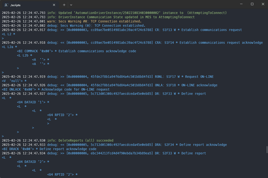 It is also interesting to see all the lifecycle messages for secs/gem happening. We can see that there was an establish communication adn a go online, followed by a set of commands to define the reports.