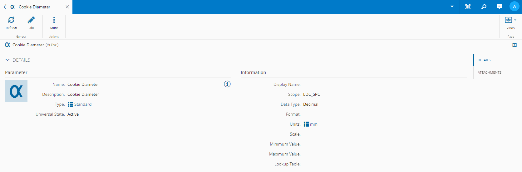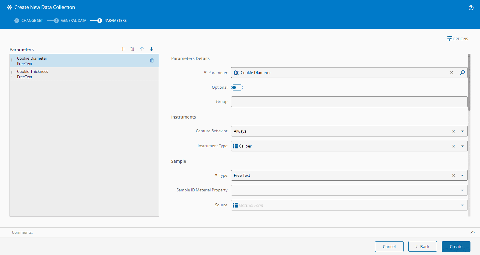 In our example of the production of cookies and the capture of their measurement data, we will be using the following Parameters: