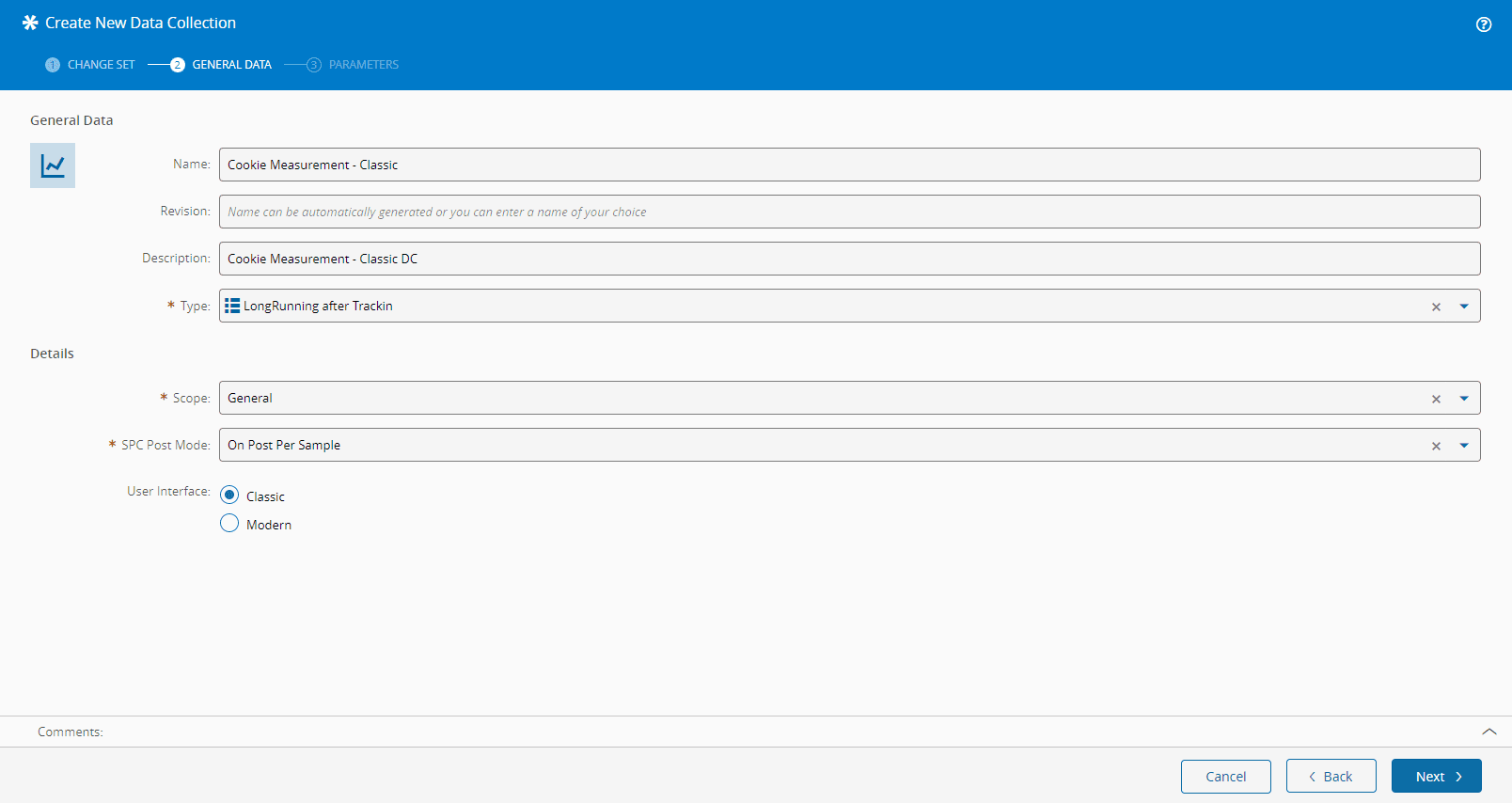When creating the Data Collections, both Classic and Modern, in the Parameters step, the following information was entered:
