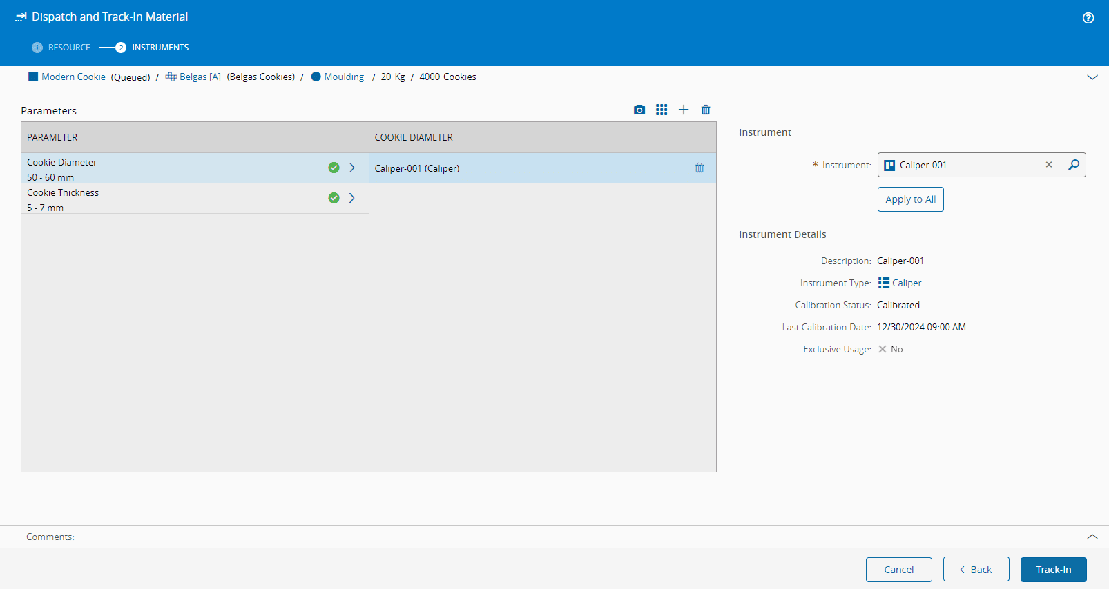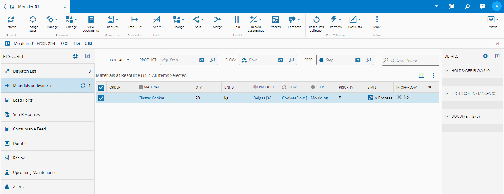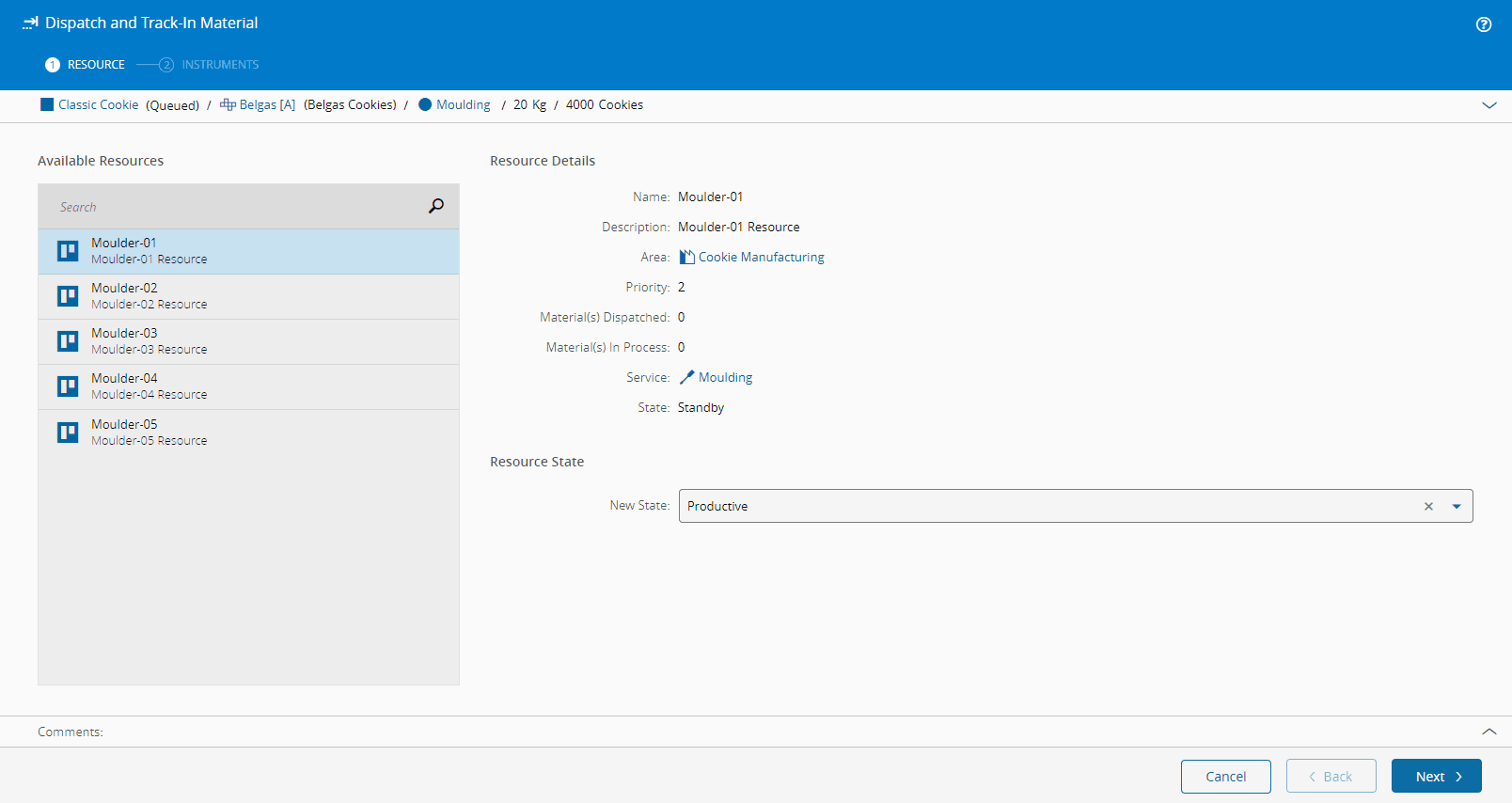 Dispatch and track in the Material to the Moulder-01 Resource, which is where we associated the Instrument we will be using:
