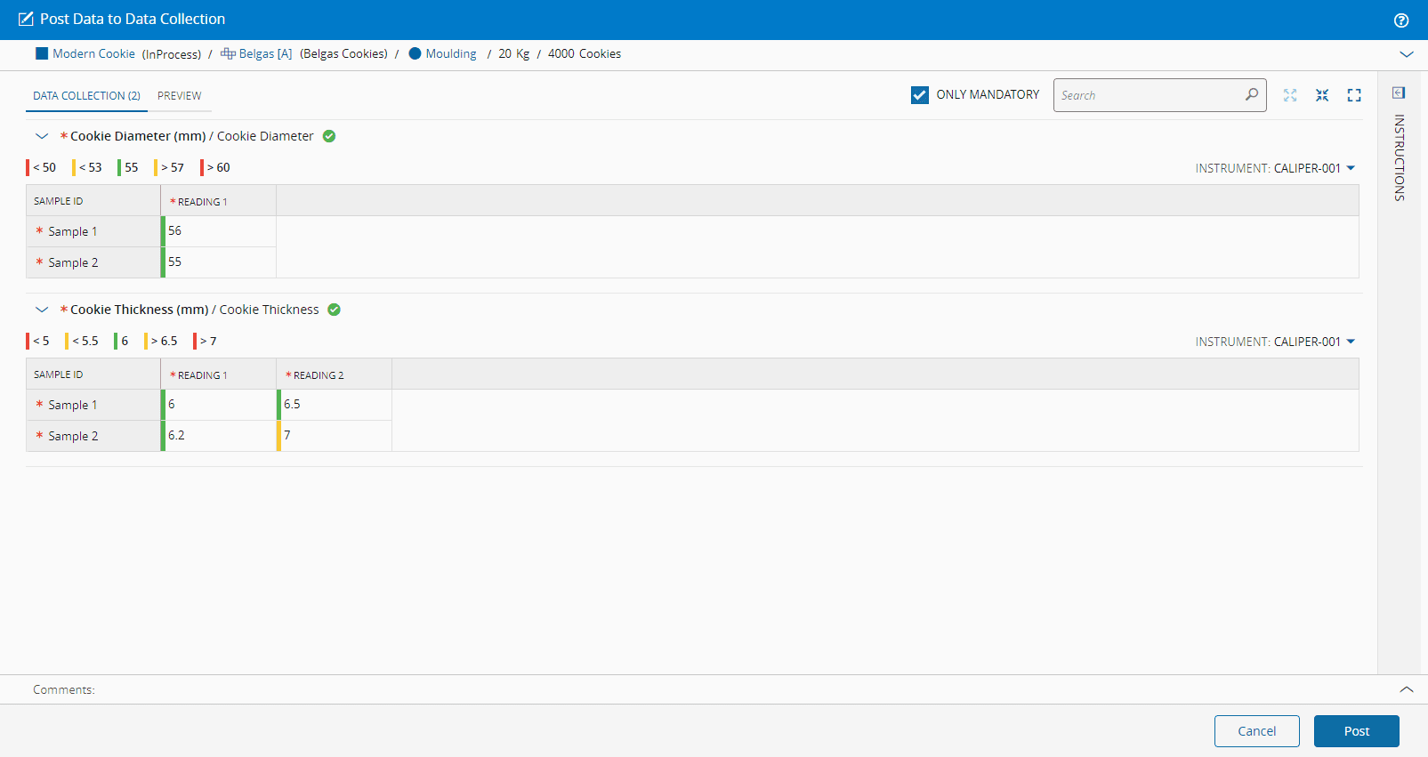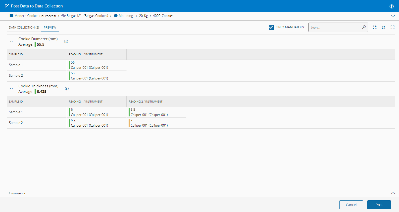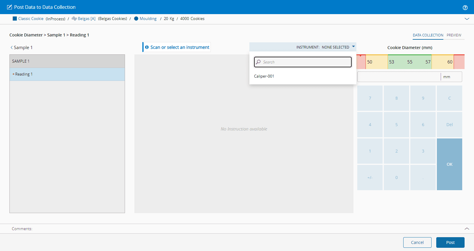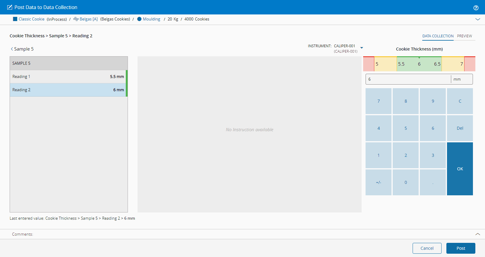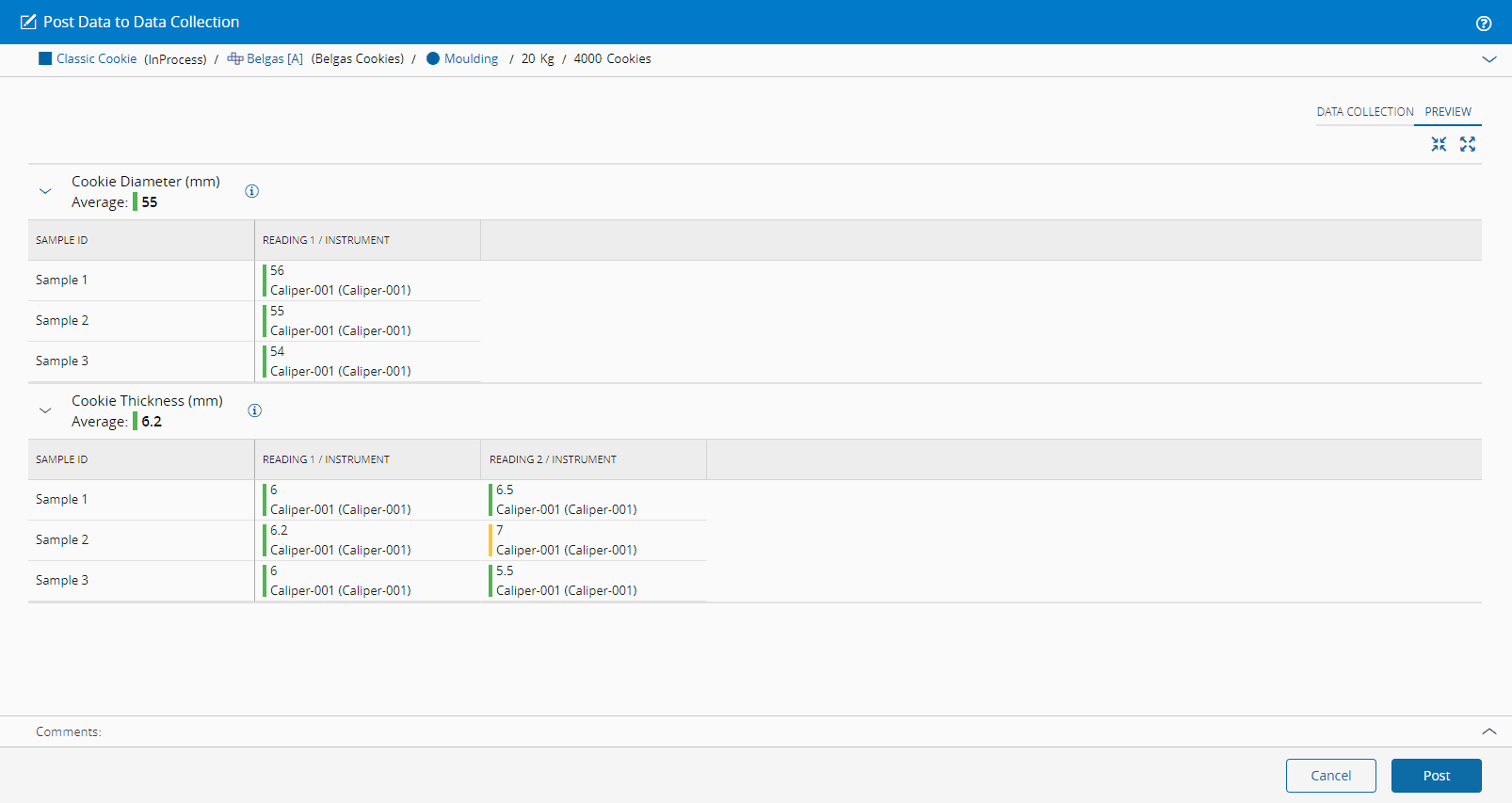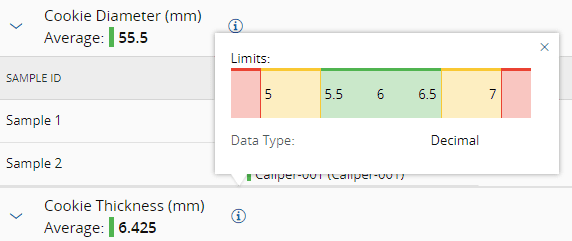 ![Screenshot showing a data collection interface with a field labeled "Cookie Diameter (mm)" displaying an average value of "55.5 x".