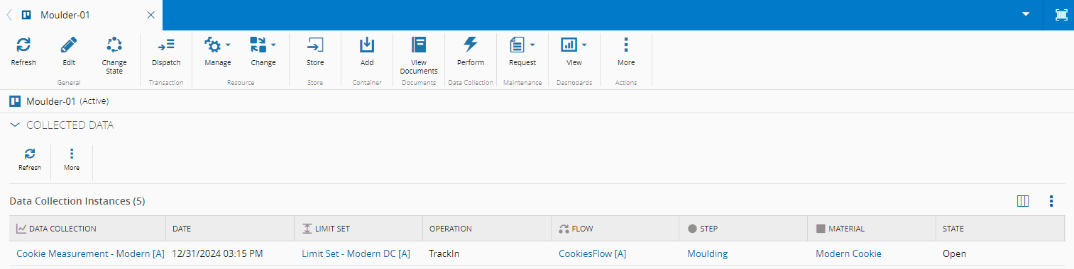 Starting with the Material in the Moulding Step, and tracking it in to the Moulder-01 Resource, we are once again taken to the Instrument information: