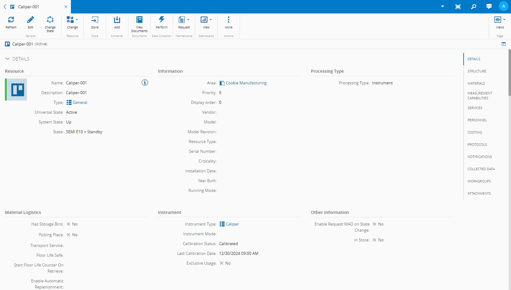 An Instrument is a Resource that has its Processing Type set to Instrument. Any newly created Instrument must be Calibrated and include a Last Calibration Date otherwise it will not be available for use.