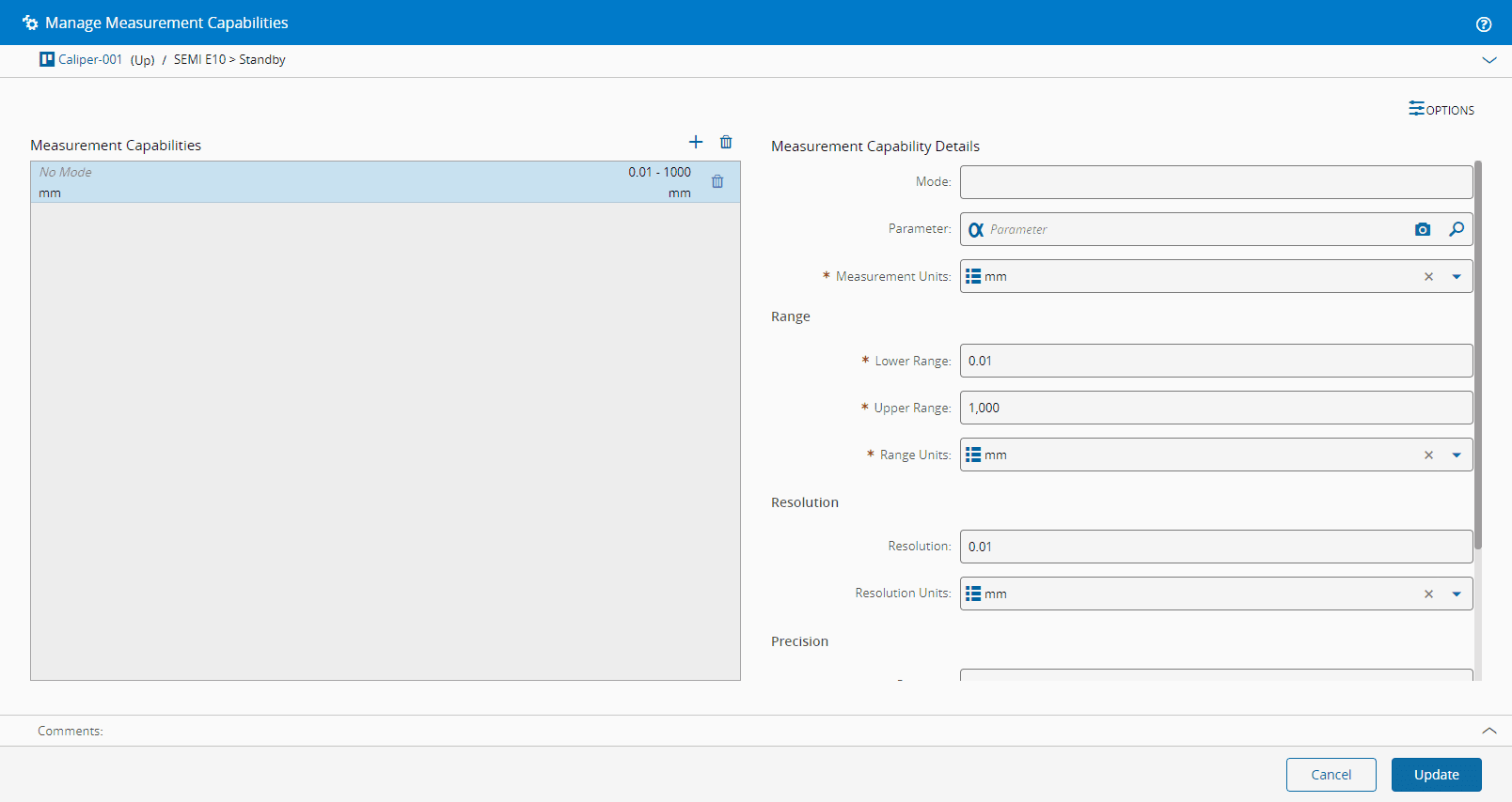 In the Manage Measurement Capabilities wizard, Measurment Capabilities Details, we will only set the Measurement Units, which will allow us to use the Instrument with both parameters. We will also set the Range and Resolution: