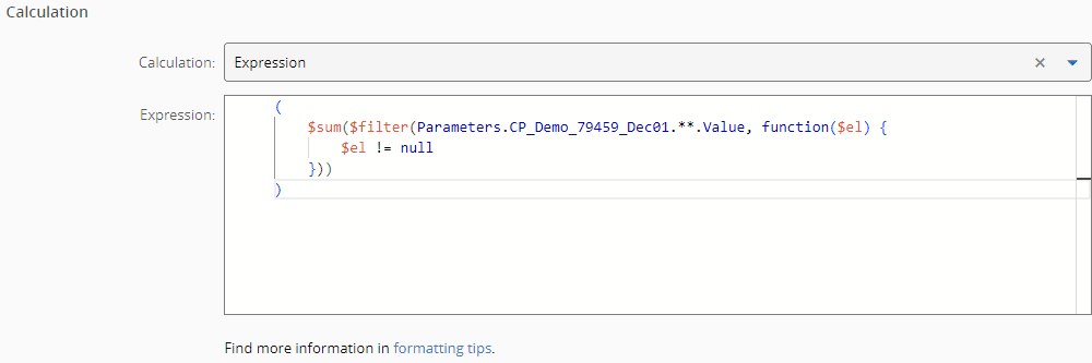 This calculation mode only receives a JSONata expression as input via a code editor with syntax highlighting. Any property that is incompatible with the current calculation mode is also hidden. In the image above, the Grouping and Limit Checking properties are hidden as they are not compatible with the Expression calculation mode.