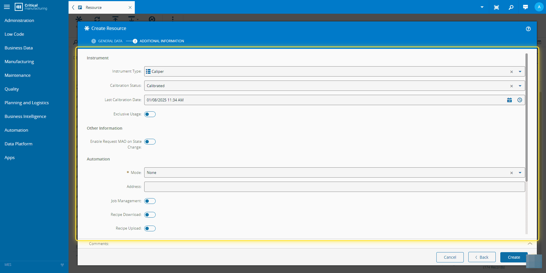 For more information, see Create Resource - Critical Manufacturing Documentation Portal ⧉