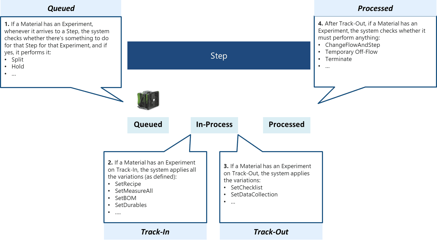| InProgress | When the Material reaches the first Step defined in the Experiment Definition it becomes InProgress. |