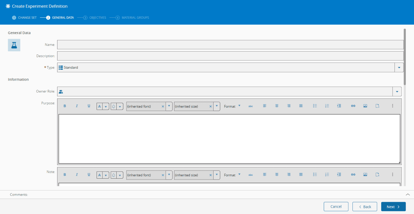 | Applicable To | To restrict the material to be selected on an Experiment, there are two options available: Product or Product Group. Depending on the selection, it will only be possible to select a material which fits the option. Neither of the two are mandatory and only the Flow can be defined |