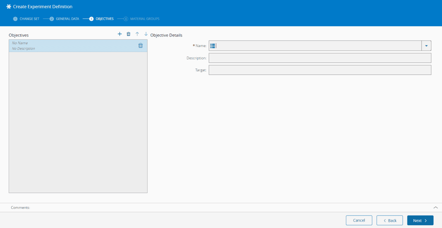 The Objectives wizard step, is used to capture the objectives of the Experiment as shown in the table and image below: