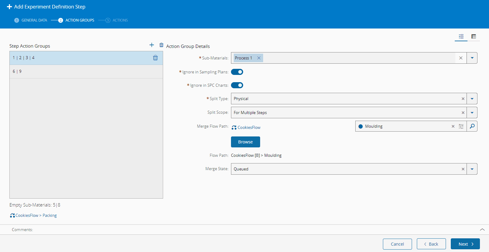 Some actions require that a split takes place before the action is performed. All splits are defined per Experiment Definition Step Material Group and will be evaluated and performed when the Material arrives at the Experiment Definition Step.