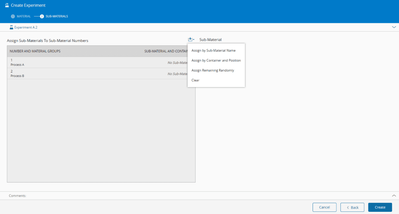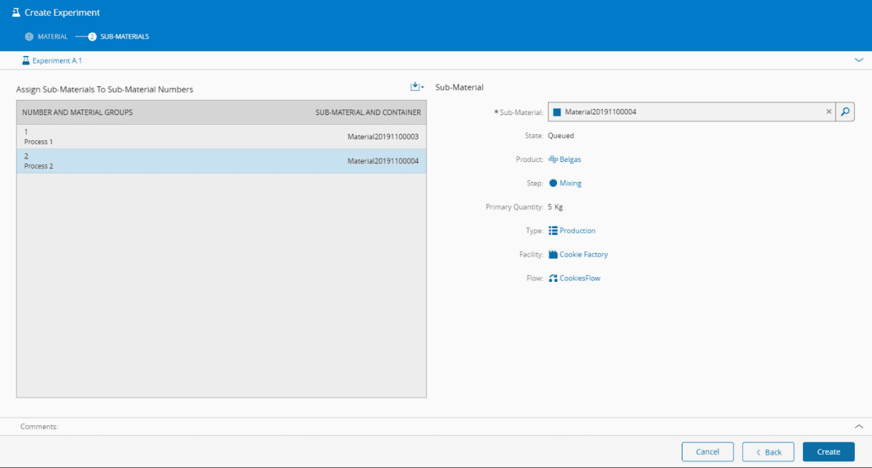 To validate the hypothesis of an Experiment Definition, the association with a Material needs to be performed. There are two ways to create an Experiment: