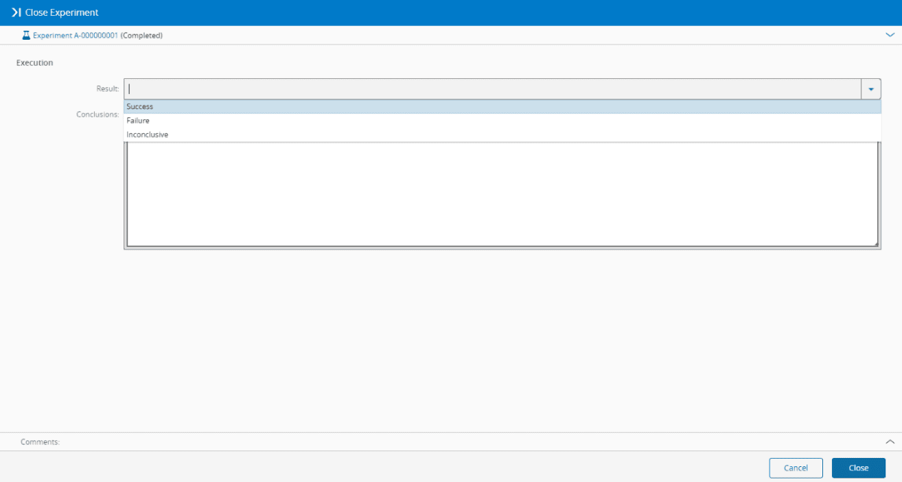 If the Experiment has the Close Experiment Automatically set to true, then it will be Closed automatically, having the option to be edited before being closed. Otherwise, the Close button will be enabled on the Experiment page. Optionally, a Result and a Conclusion can be associated with the Experiment, as shown in the image below: