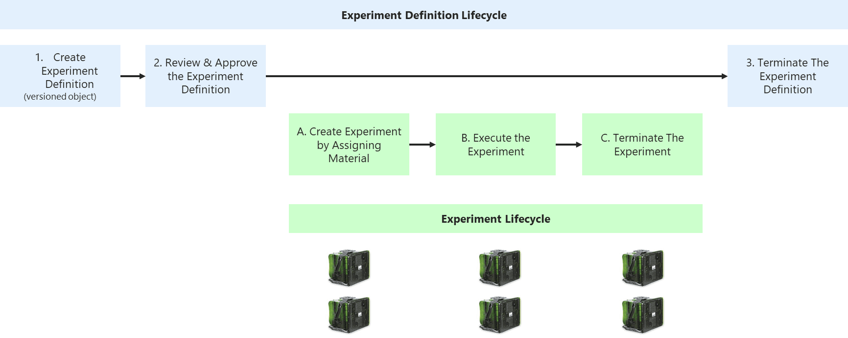 There are essentially two core objects that make up the Experiment Management Module as shown in the image below. The Experiment Definition (shown in blue) is a template from which Experiments can be created. The Experiment (shown in green) is the actual running Experiment and that must have a Material associated with it. The Experiment Definition is a versioned object that follows the normal lifecycle of a versioned object.
