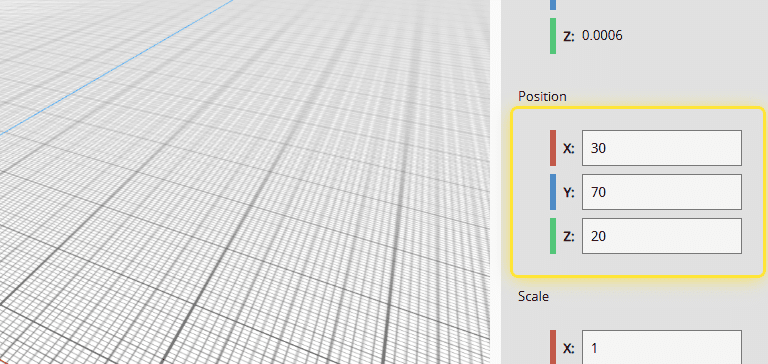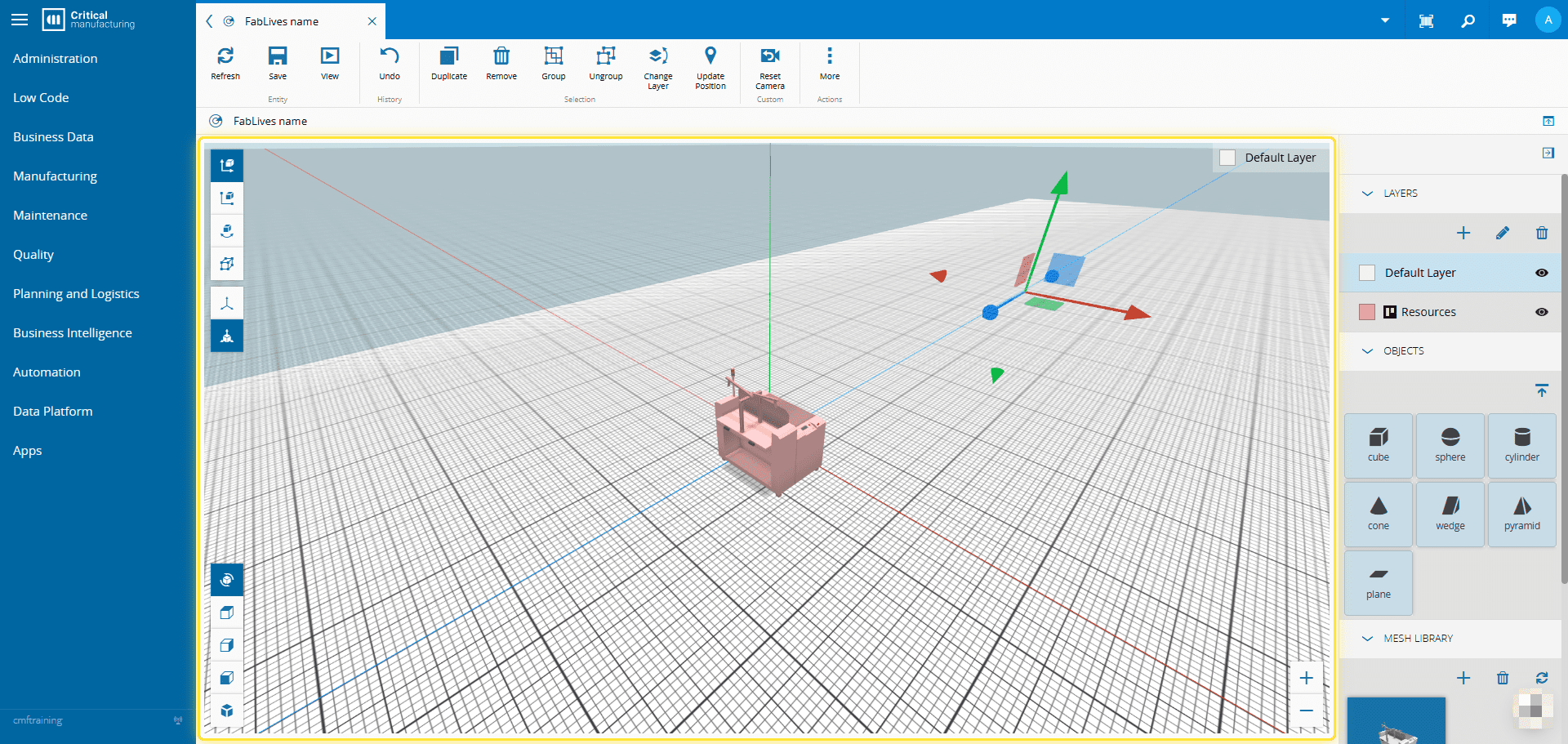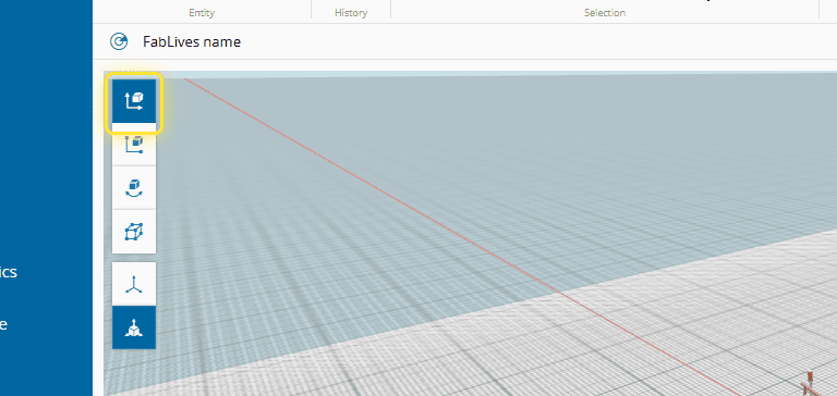How to: Translate (move) an Object in FabLive# 1. Double Click the object to select it.# 2. Select the Translate option.# 3. Drag the handles (gizmos) around the object to move it.# 4. Alternatively, expand the Selection property panel.# 5. and edit the object position.#